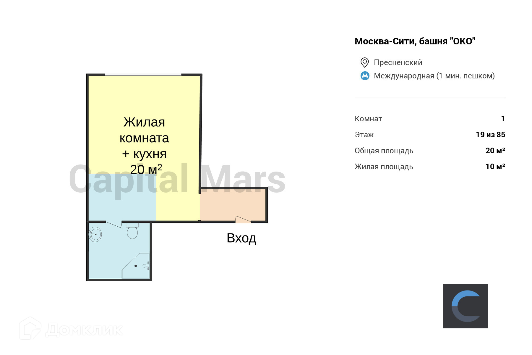 1-комнатная квартира, 20 м2, этаж 19 / 85, на продажу в Москве, 1-й Красногвардейский проезд, 21с2
