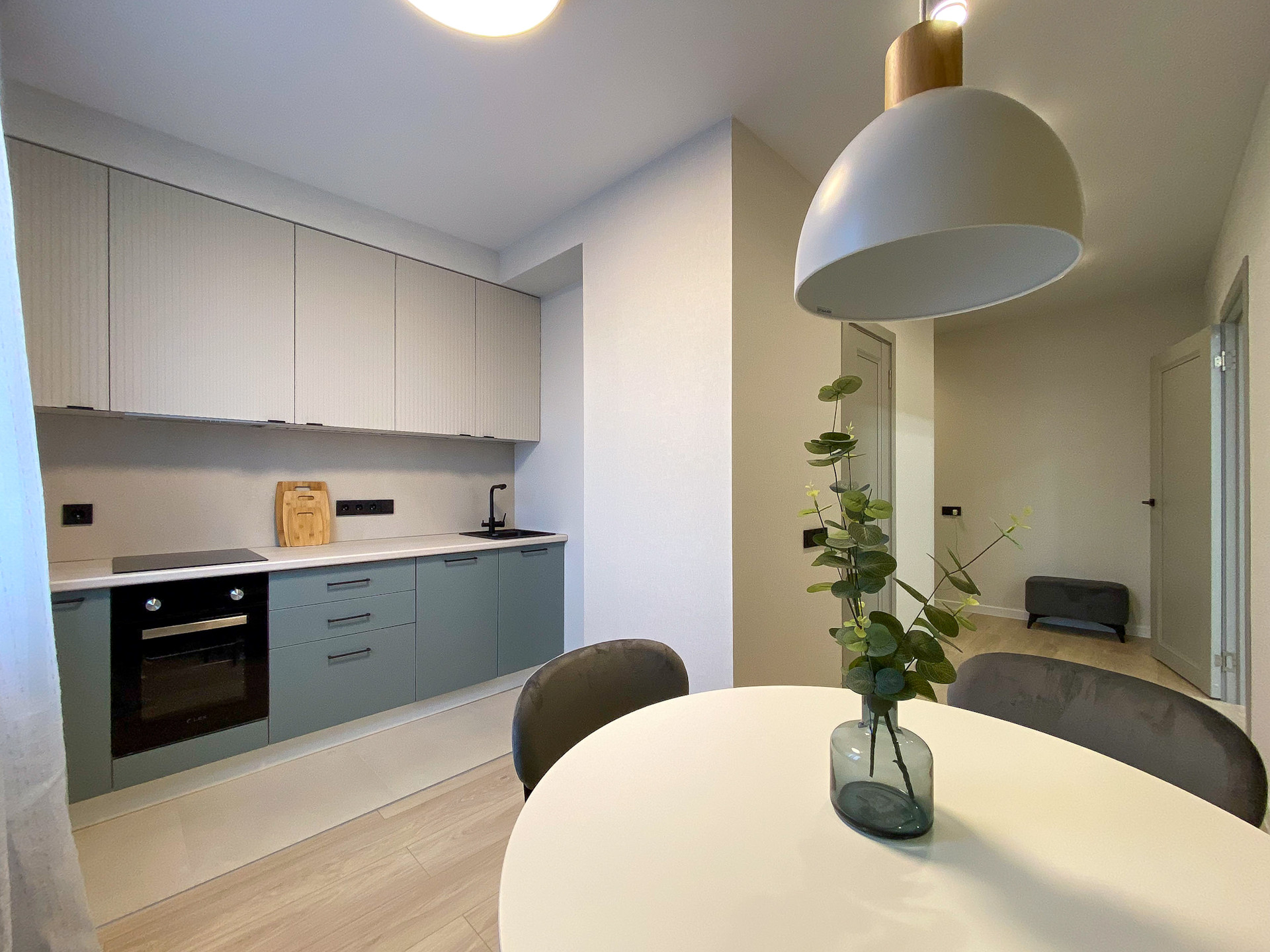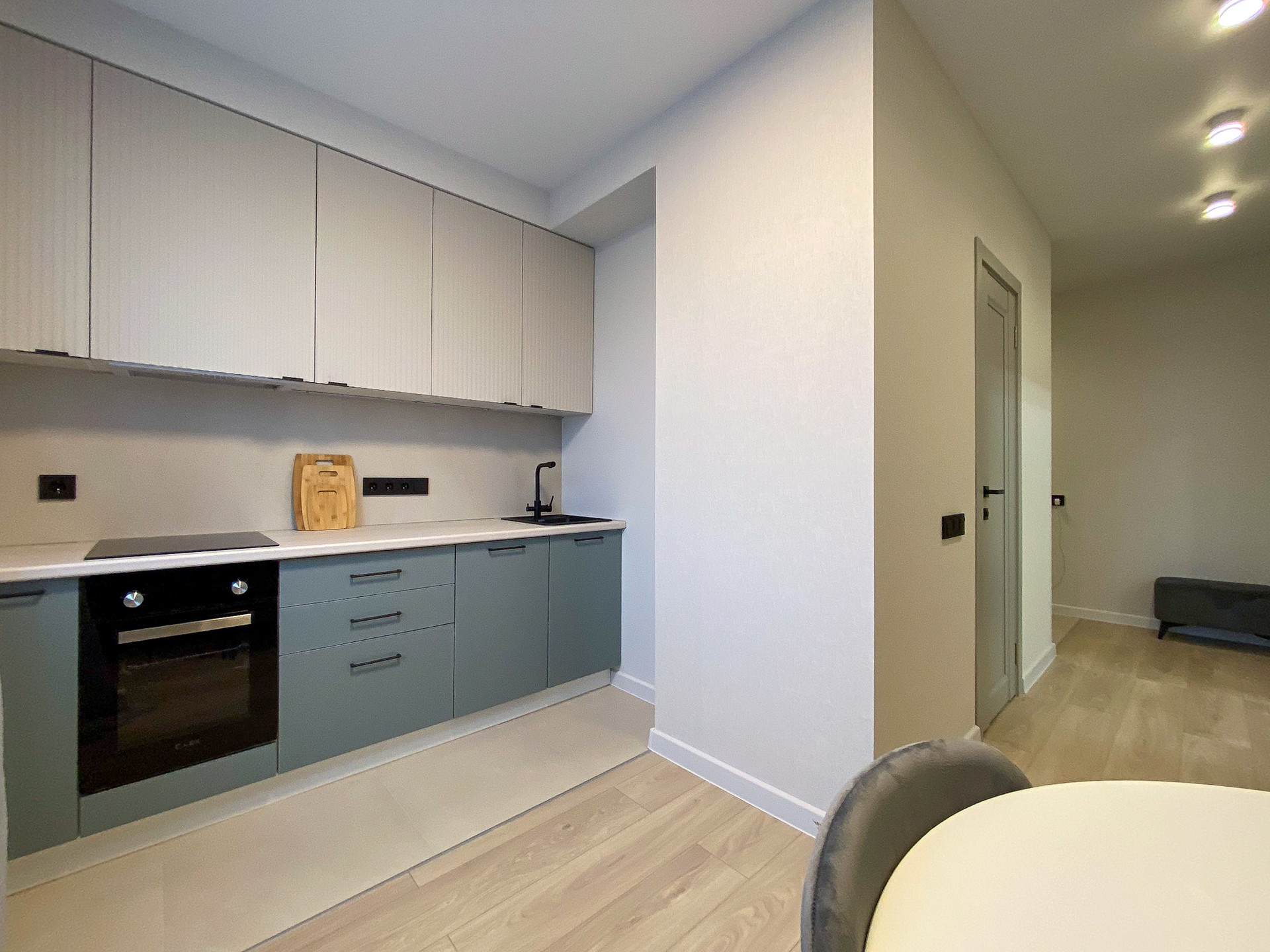 Кухонный гарнитур со встроенной техникой: электрическая варочная поверхность, вытяжка, духовой шкаф, посудомоечная машина, мойка, техника остаются новым владельцам.
