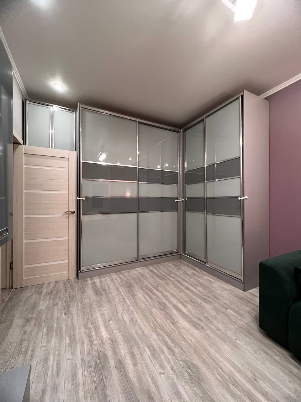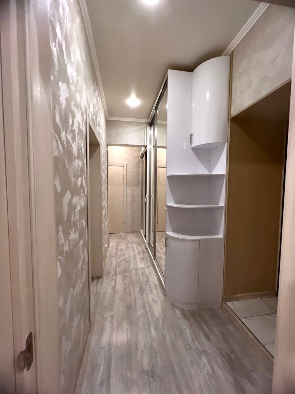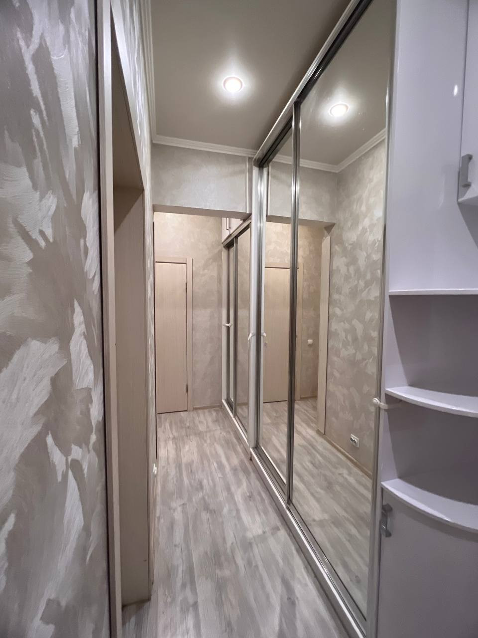 Много место для хранения - модульные шкафы под потолок находятся в каждой комнате и в коридоре. Также, много зеркал, которые визуально увеличивают квартиру.