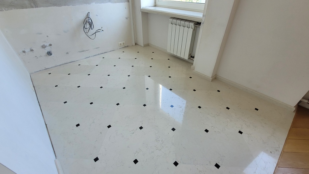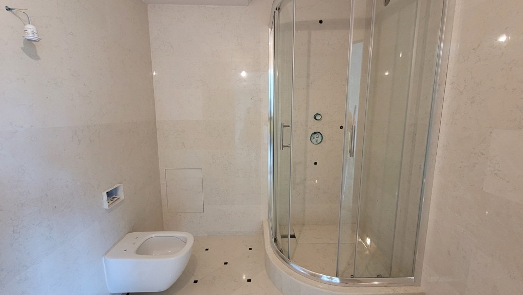 В комнатах на полу немецкий дорогой паркет из натурального дуба (уложен французской ёлочкой, полностью готов), установлены мраморные подоконники. Пол на кухне, а также санузел полностью отделаны натуральным итальянским мрамором, полы в санузле и на кухне с подогревом, установлена импортная сантехника, инсталляция «Geberit», душевая кабина «Grohe» из чешского закалённого стекла размер 1,2 м *1,2 м. слив «Geberit»,