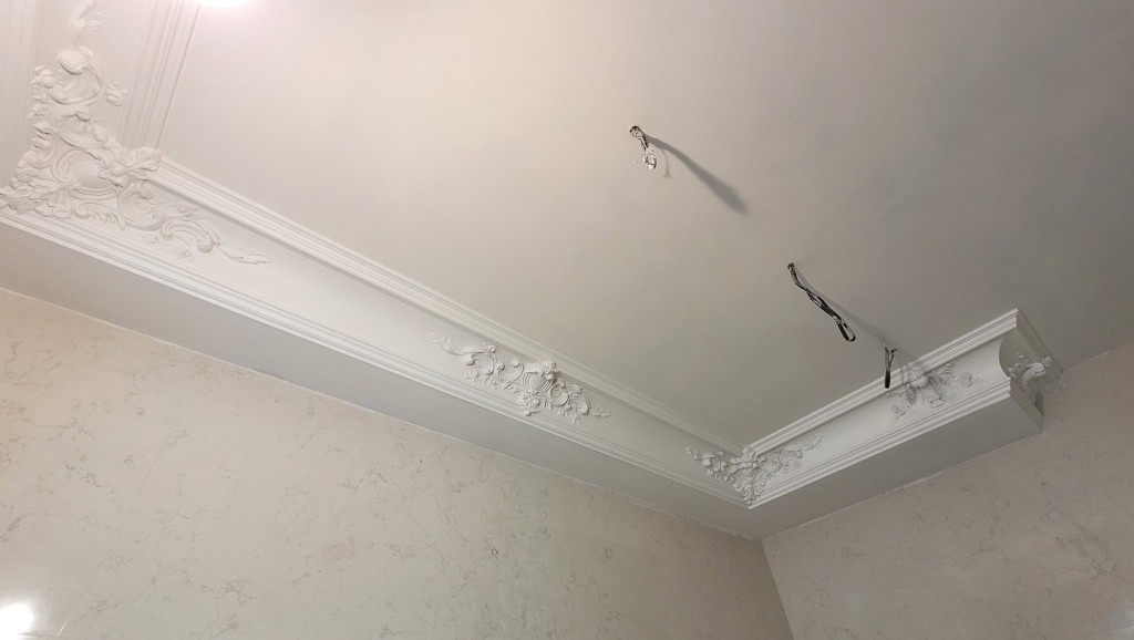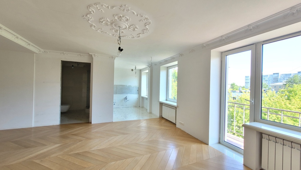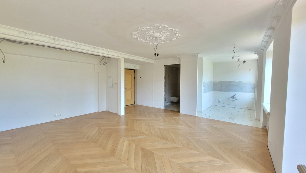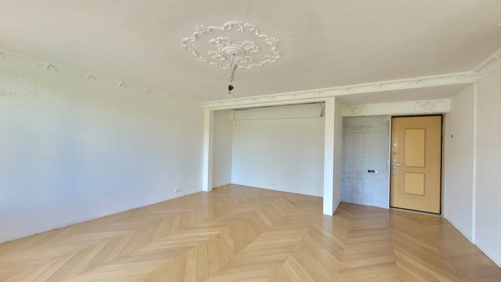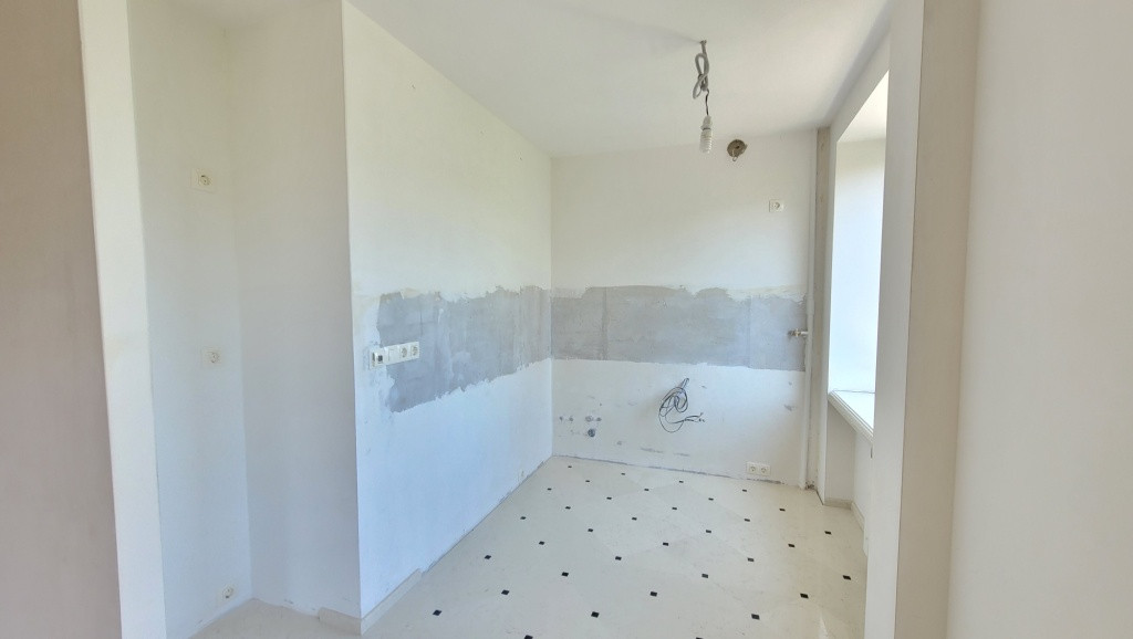 Отделка: Потолок выровнен и отделан лепниной из натурального гипса, стены выровнены и полностью подготовлены под покраску или под обои на Ваш вкус. По желанию, можно сделать двухкомнатную квартиру, для этого надо установить перегородку между спальней и кухней-гостиной.