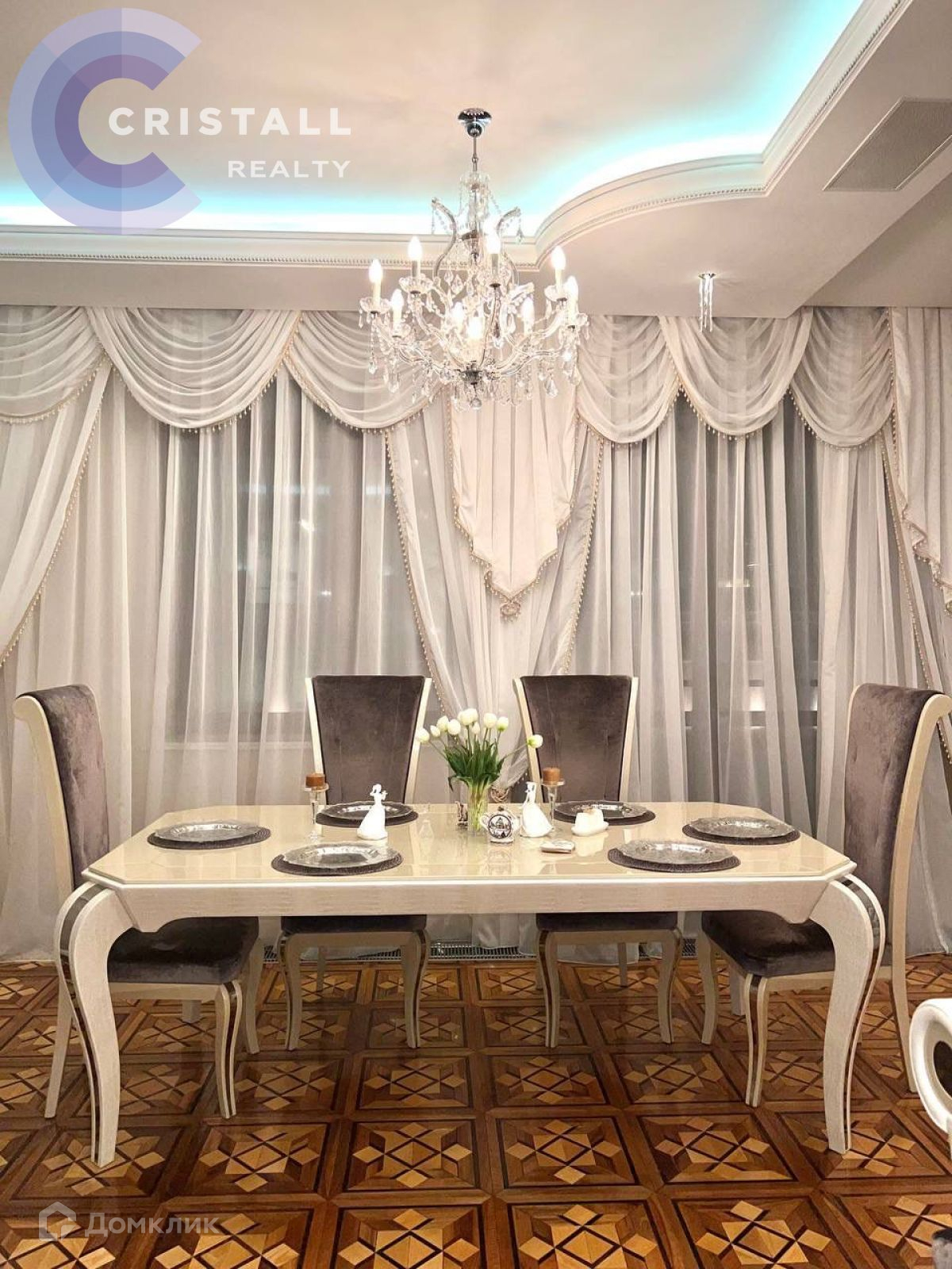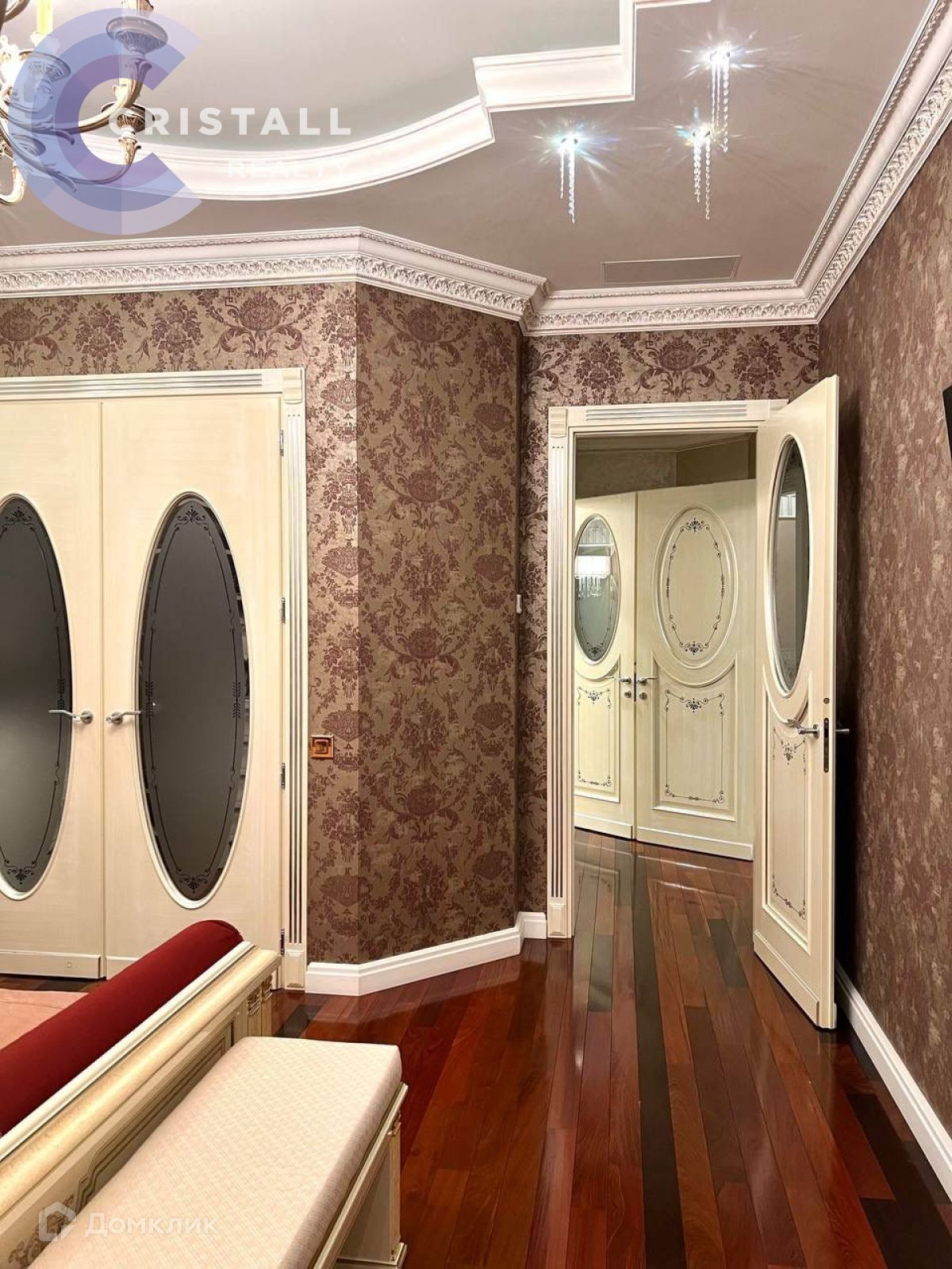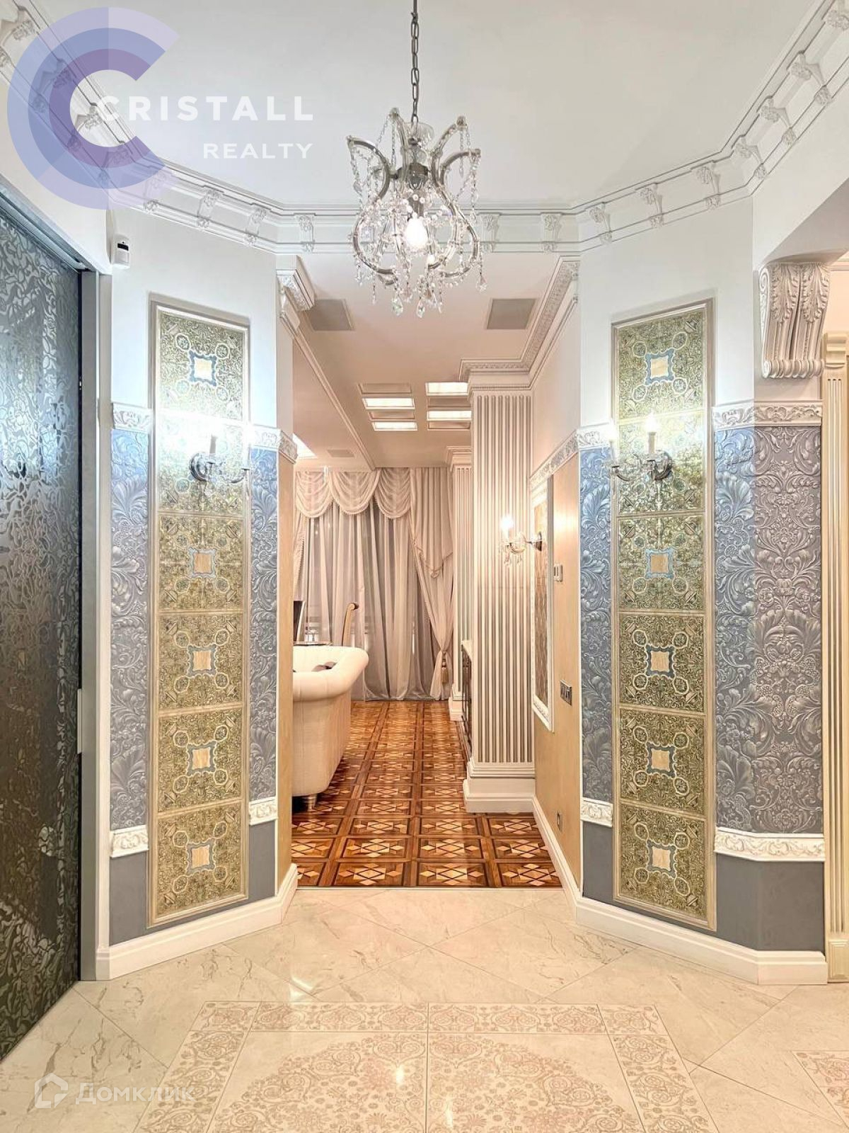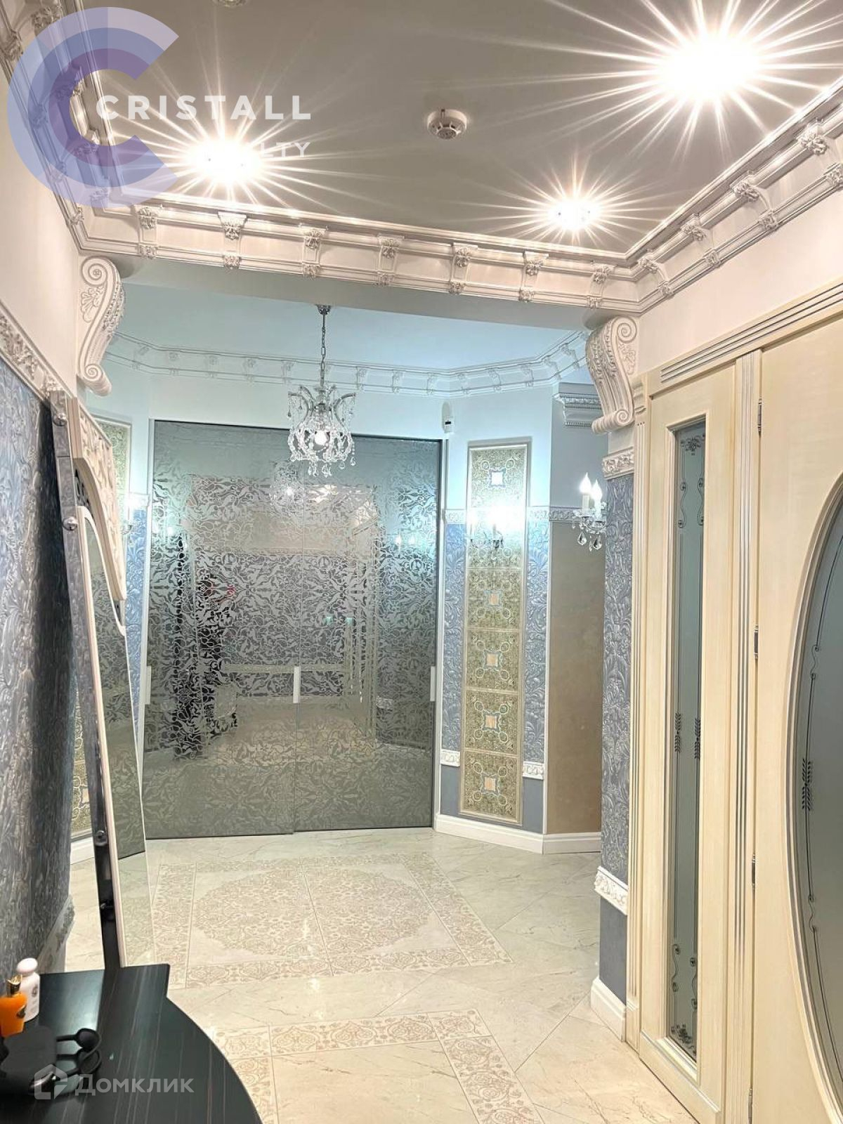 Дизайнерский ремонт с использованием дорогих материалов: на стенах лепнина ручной работы, в ремонте использованы вкрапления серебра и золота, в освещении использованы кристаллы Swarovski, на полу в жилых комнатах паркет, в прихожей, кухне и санузлах полы с подогревом. Датчики контроля протечки.