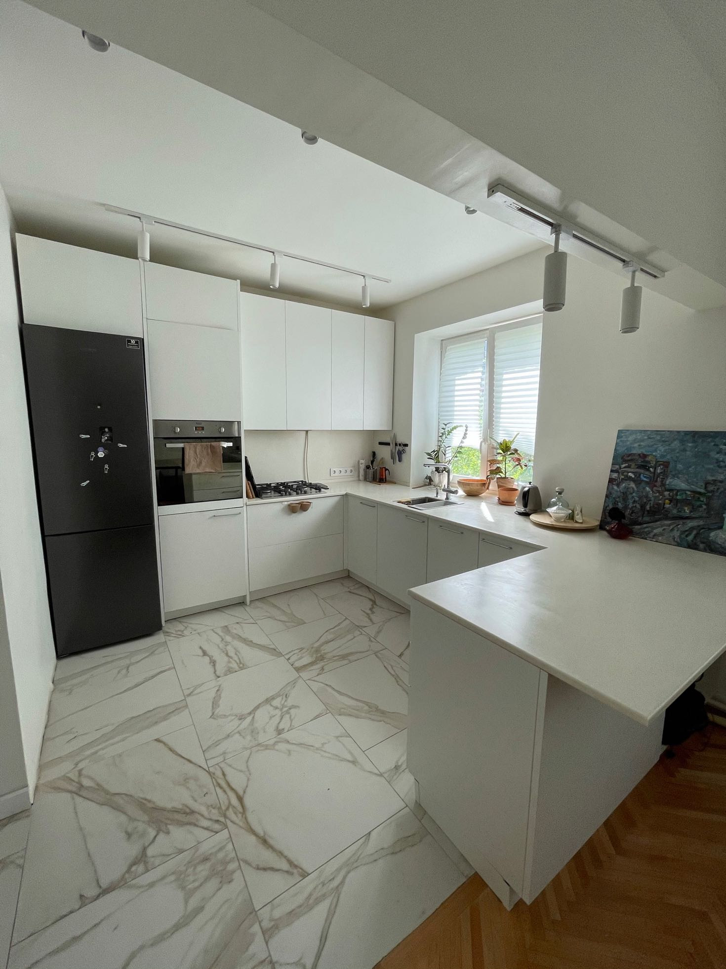 Соединенная  кухня-гостиная, просторная кухня со всей техникой. Два санузла, один с ванной. Гардеробная 3м