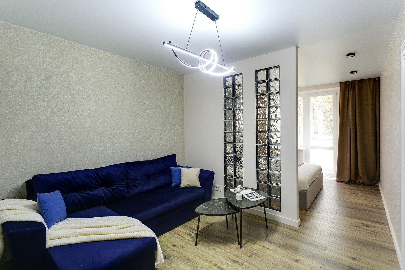 В квартире проведена полная замена электропроводки, труб, выровнены стены и пол, сделан натяжной потолок, закуплена новая мебель и техника - заезжай и живи.