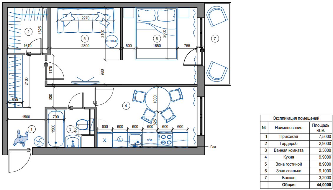 Общая площадь 42.4 м2