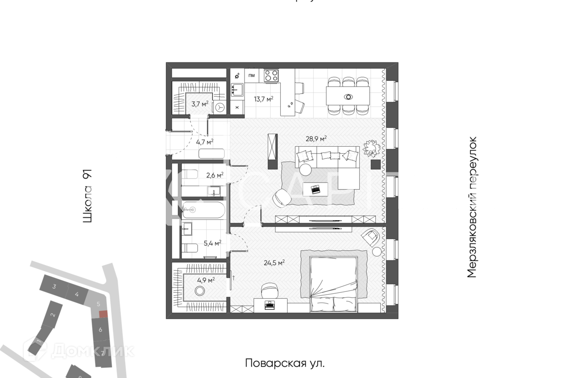 2-комнатная квартира, 88.4 м2, этаж 4 / 7, на продажу в Москве, Поварская улица, 8/1к1