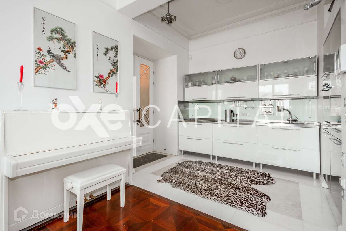 Квартира состоит из просторной прихожей, из которой через двустворчатые двери вы попадаете в гостиную с тремя огромными окнами и в кухню-столовую, также гостиная также гостиная и столовая объединены двухметровым проемом с раздвигающимися стеклянными дверями.