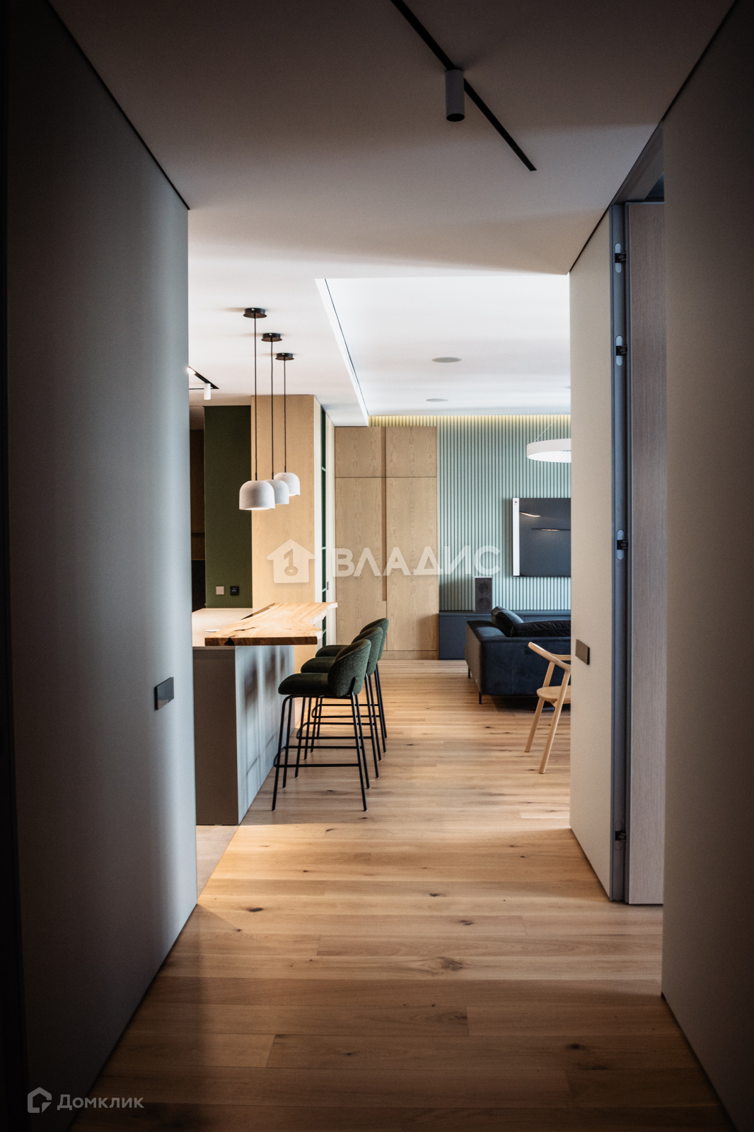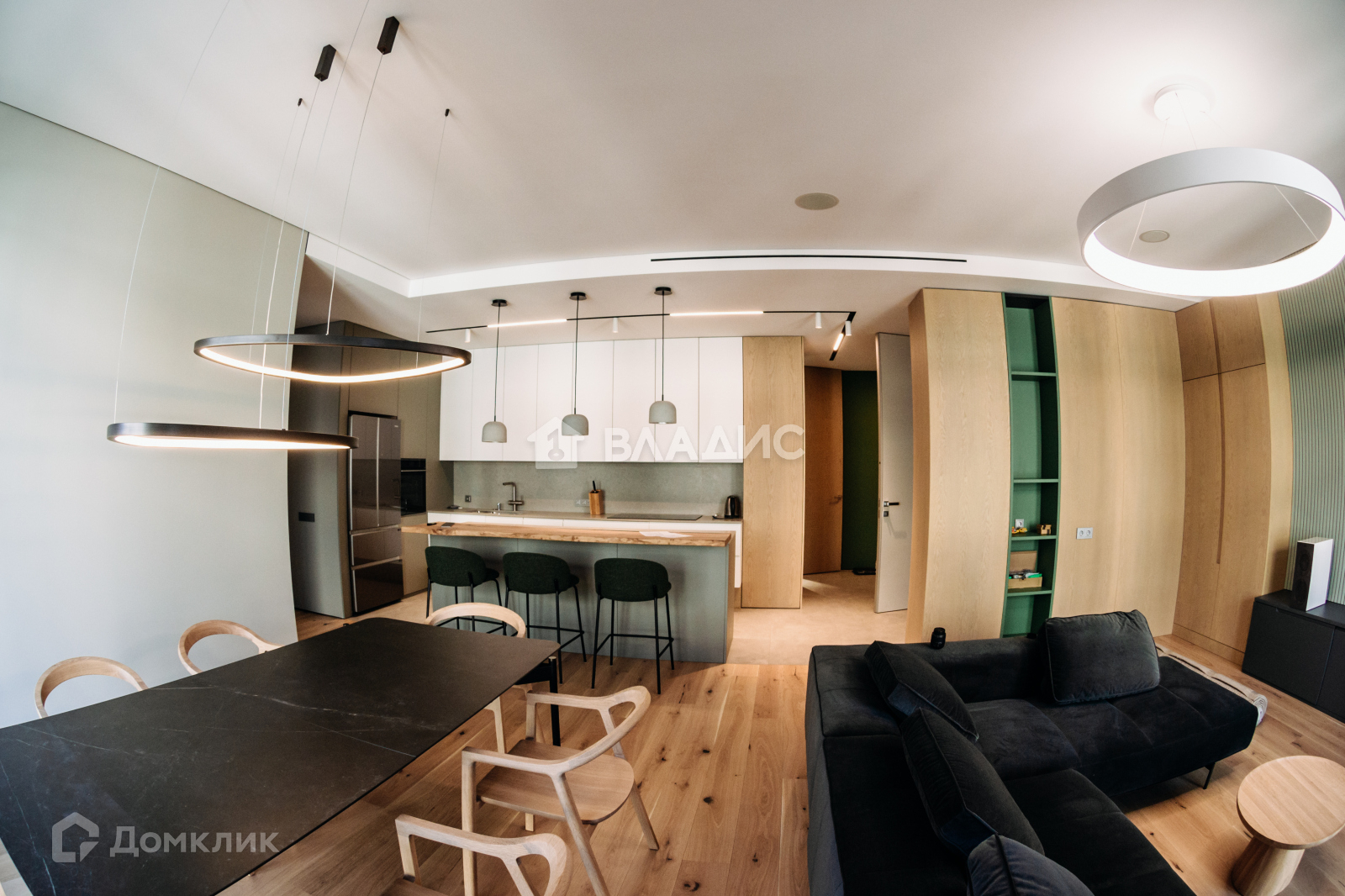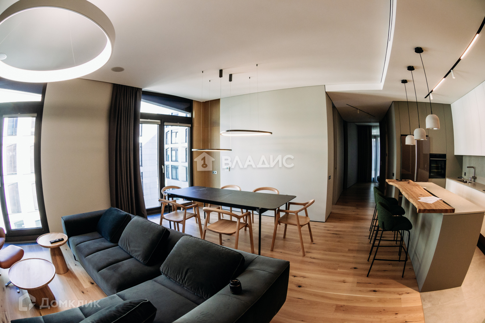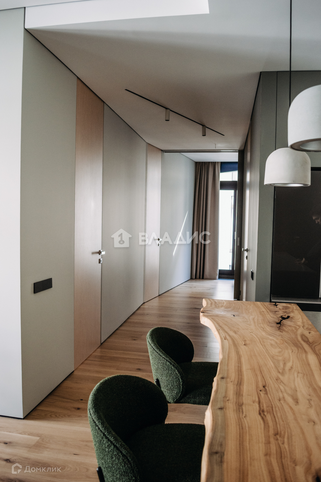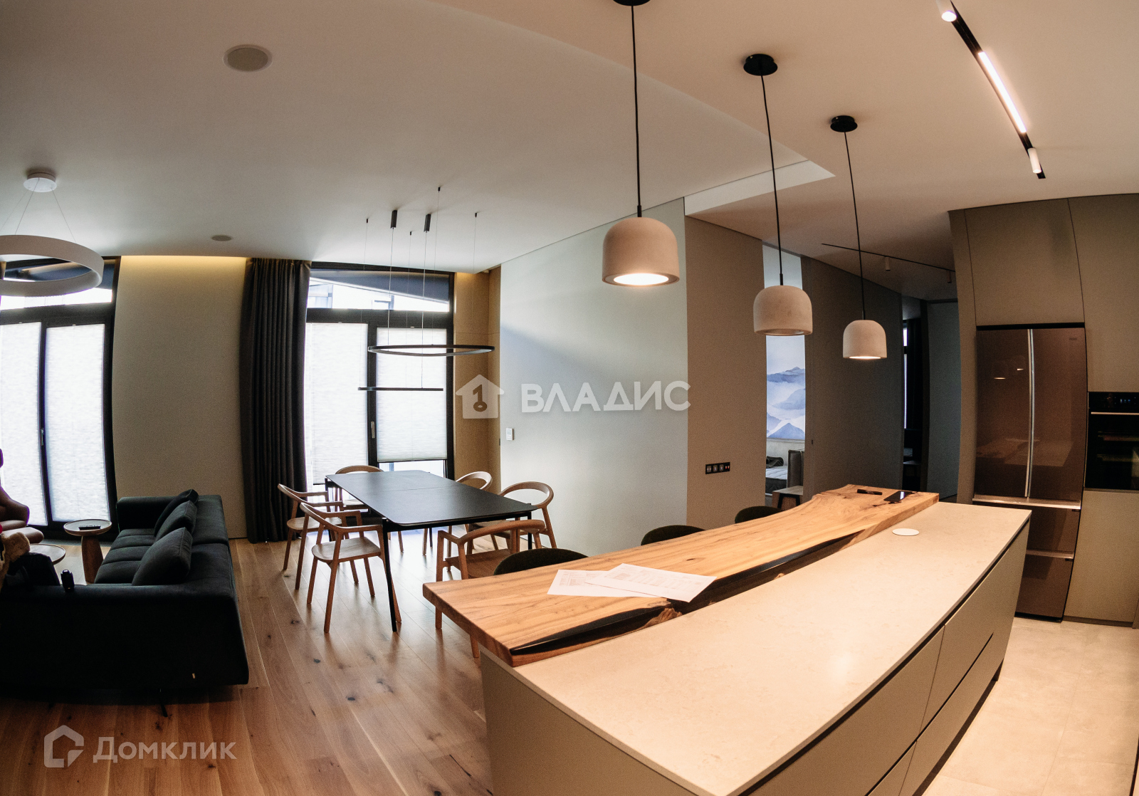 Грамотная планировка: при входе попадаешь в просторную прихожую. По правую руку - прачечная со стиральными машинами, сушильным шкафом и классической сушилкой. По левую руку - санузел с душем. Пройдя вперёд, попадаешь в просторную гостиную с панорамными окнами. Справа от гостиной - кухня с отдельно стоящим островом и барной стойкой. Напротив - большой обеденный стол на восемь персон. Немного дальше располагаются детские, гостевые и мастер-спальня с собственным санузлом и финской сауной. В конце коридора, за раздвижной дверью - тихий уголок с панорамным окном, который может служить гостевой комнатой, рабочим кабинетом, или уединенной зоной для чтения книг.