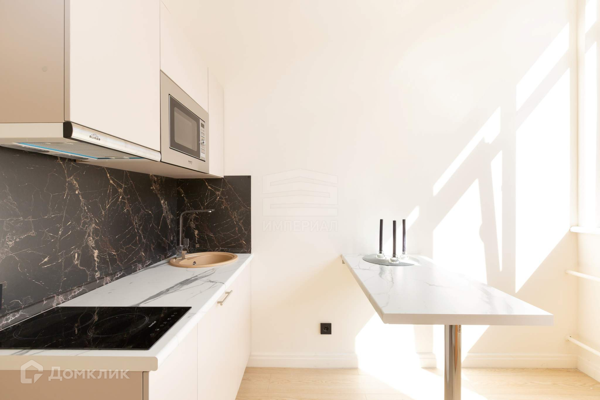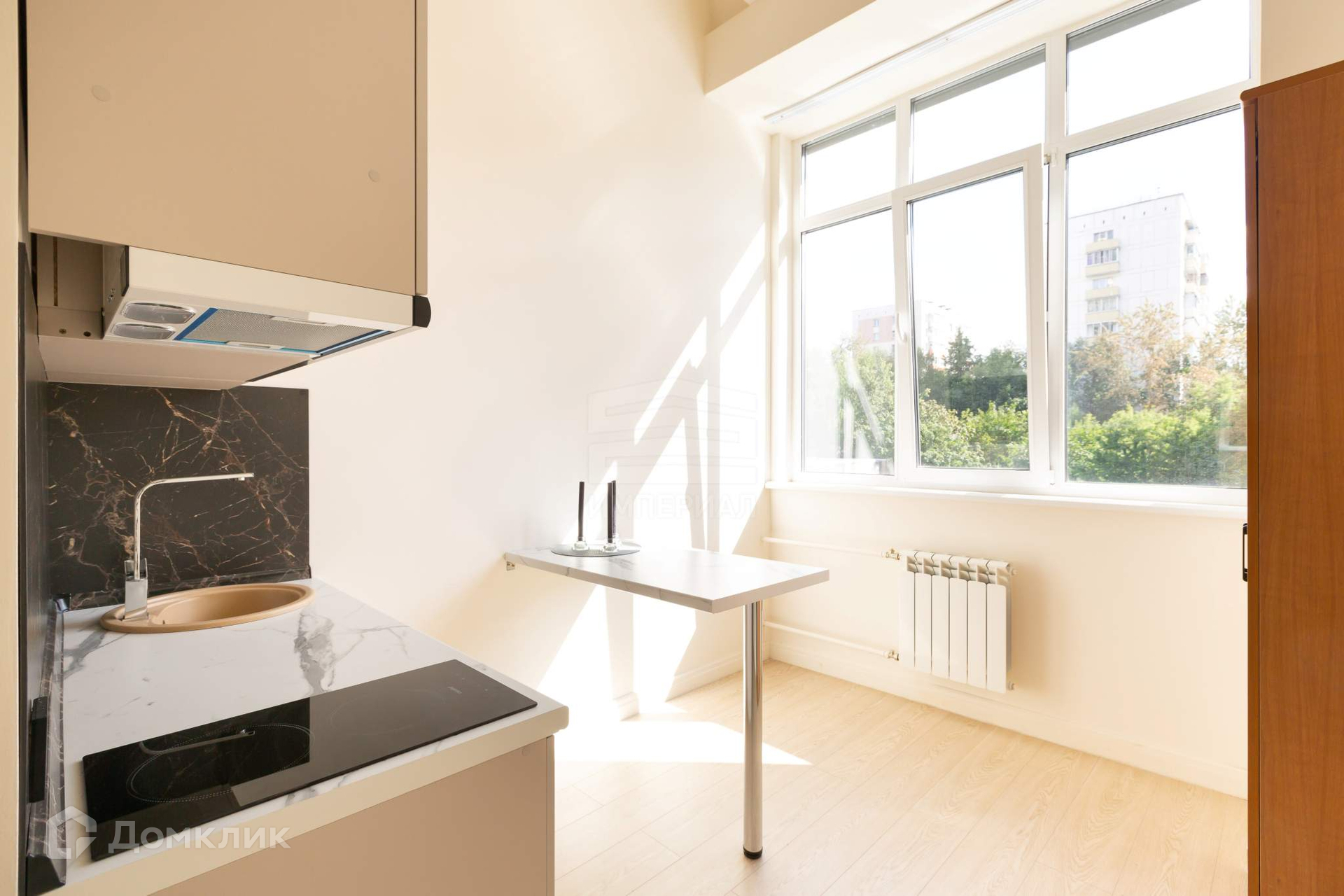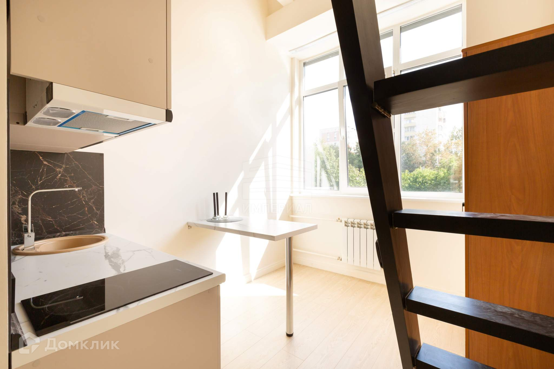 Студия с большим окном, с установленными двухкамерными стеклопакетами, отделка выполнена в светлых нейтральных тонах, сборная мебельная антресоль и высокие потолки (3,75 м) позволяют увеличить используемое пространство. Современная импортная сантехника  душевой поддон, раковина, унитаз с гигиеническим душем, электрический полотенцесушитель.