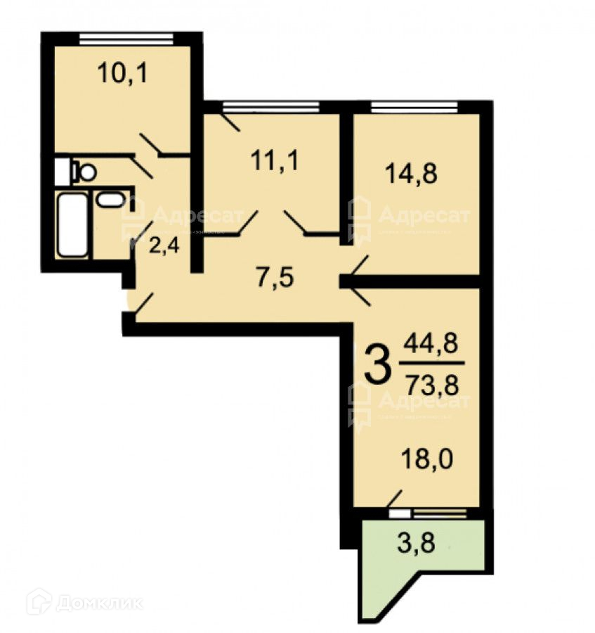 Жилая площадь 44.8 м2