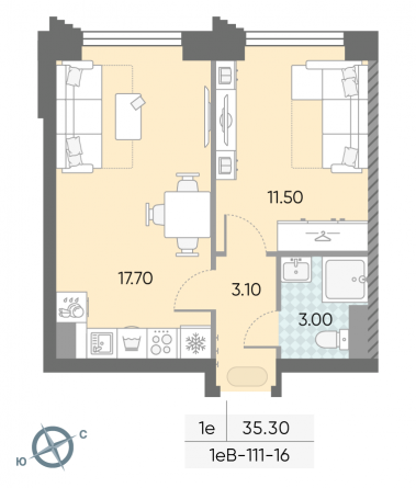 Общая площадь 36.9 м2