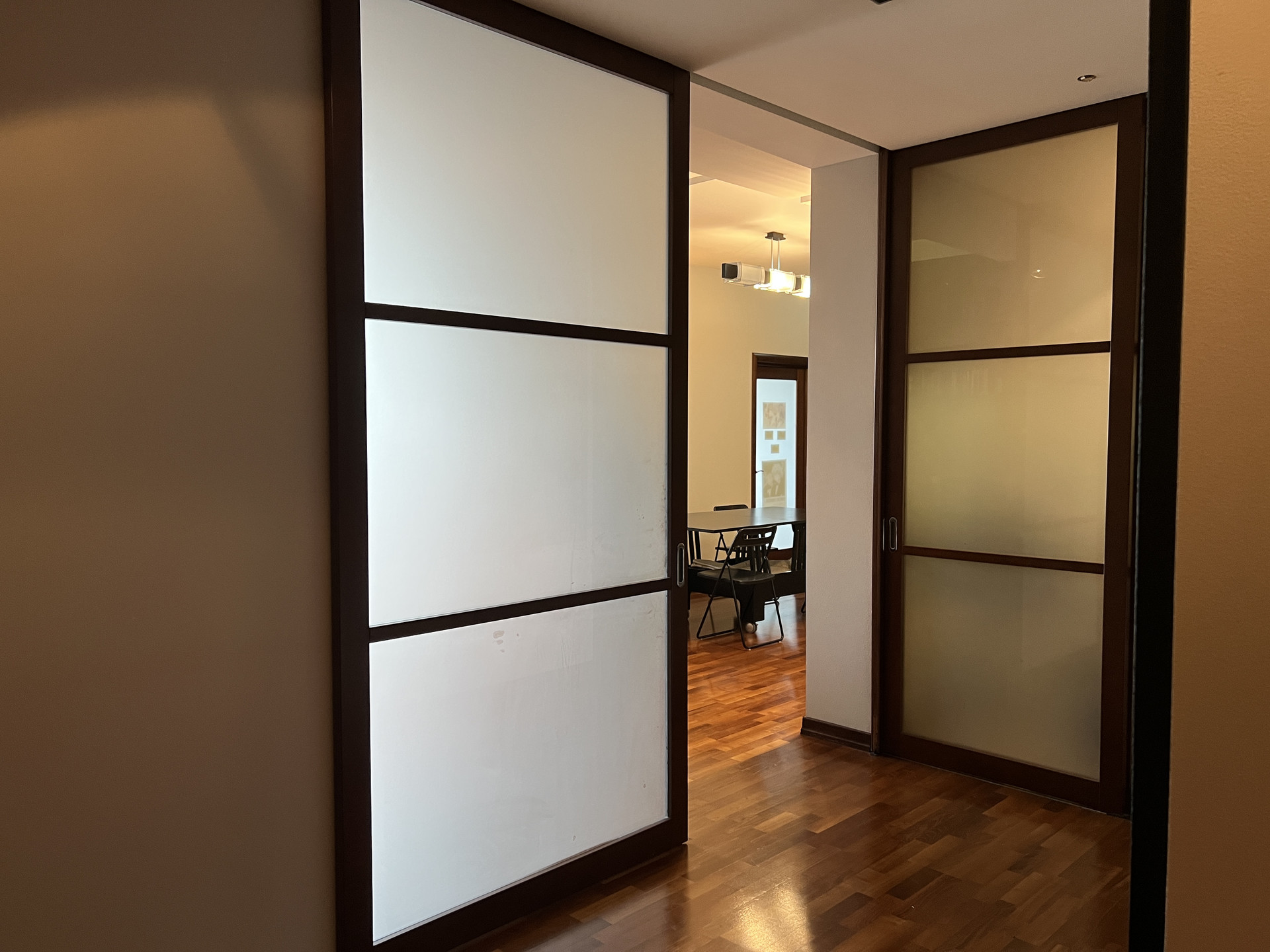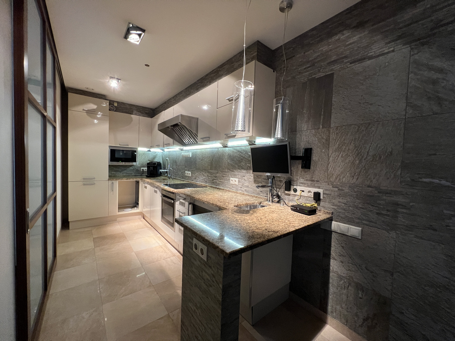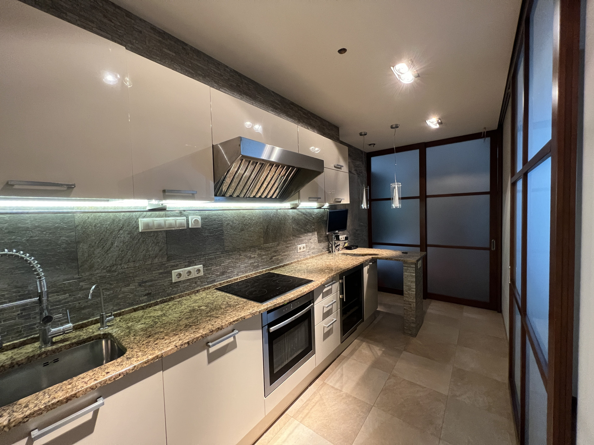 В квартире выполнен ремонт по индивидуальному проекту. Имеется панорамное остекление во всех комнатах, что дает много пространства и света, а также уникальное дизайнерское решение в виде выдвигающейся стены, которая разделяет квартиру на две части.