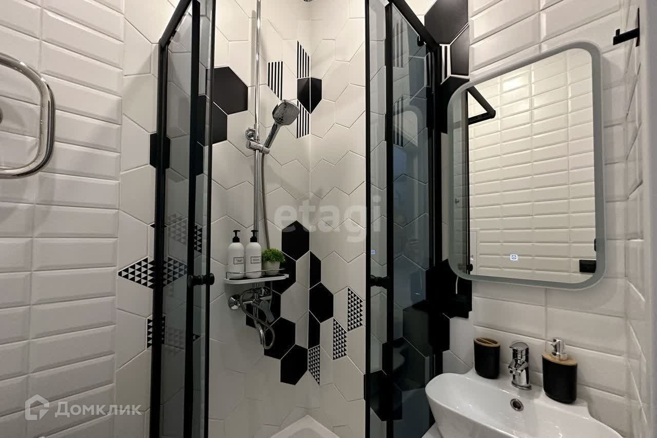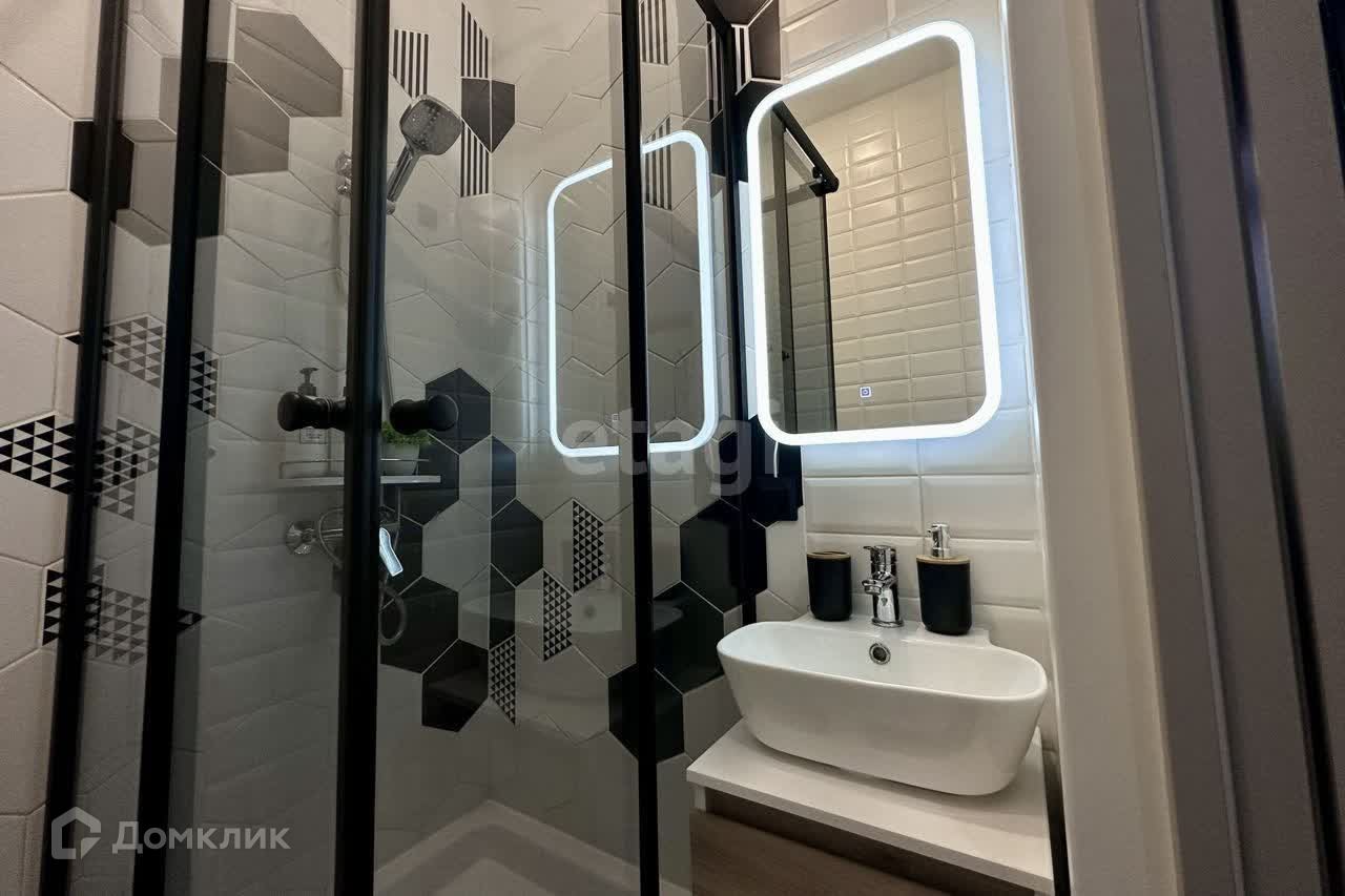 В ванной комнате современная душевая кабина, зеркало с подсветкой, подвесная тумба и другие продуманные удобства.