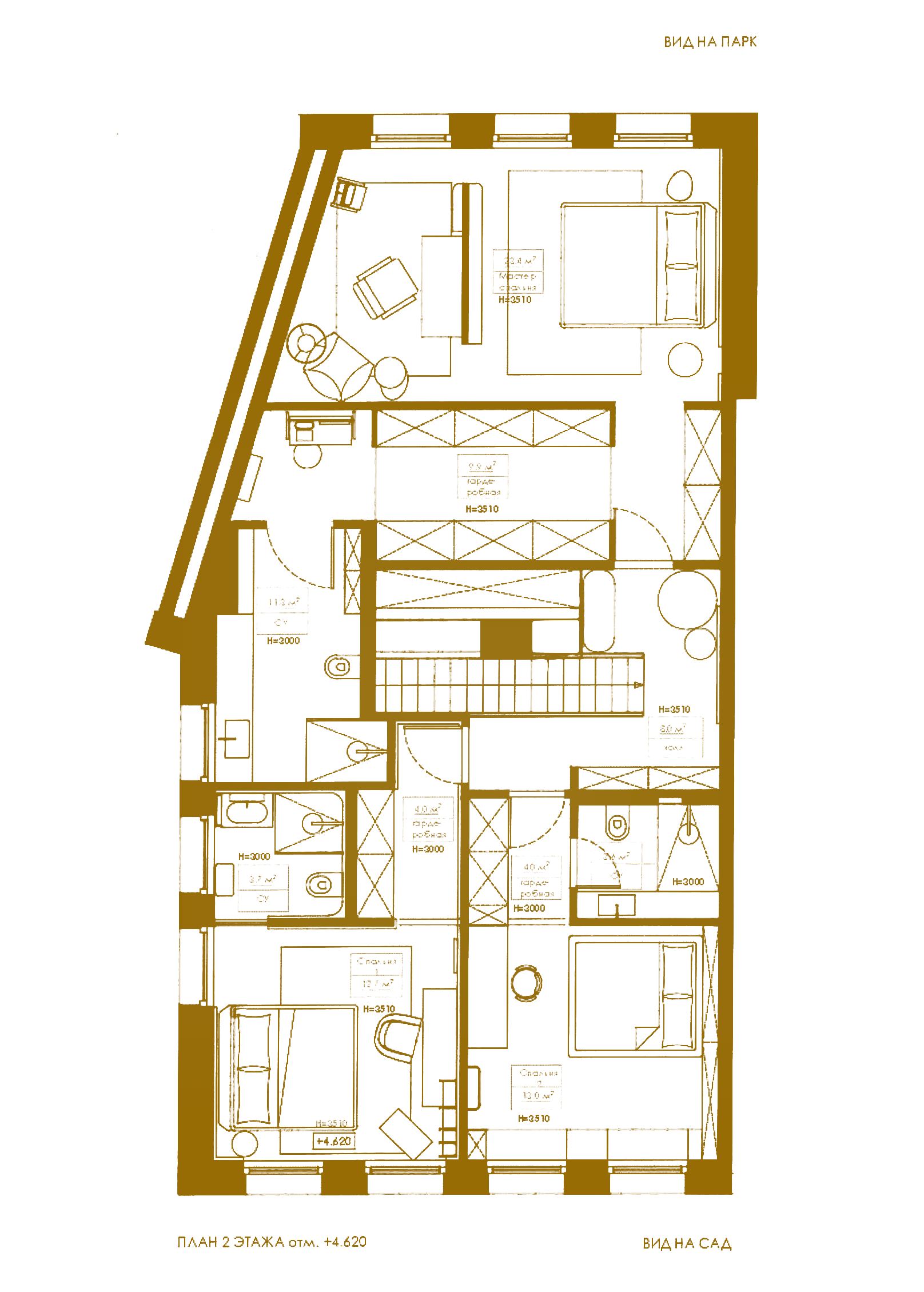 Мастер-спальня 2 – 13 м2; Гардеробная при спальне 2 – 4 м2; С/у при спальне 2 – 4 м2; Мастер-спальня 3 – 13 м2; Гардеробная при спальне 3 – 4 м2; С/у при спальне 3– 4 м2;