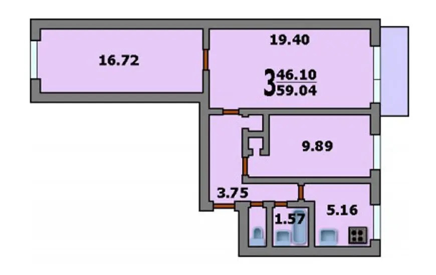 Общая площадь 57.4 м2