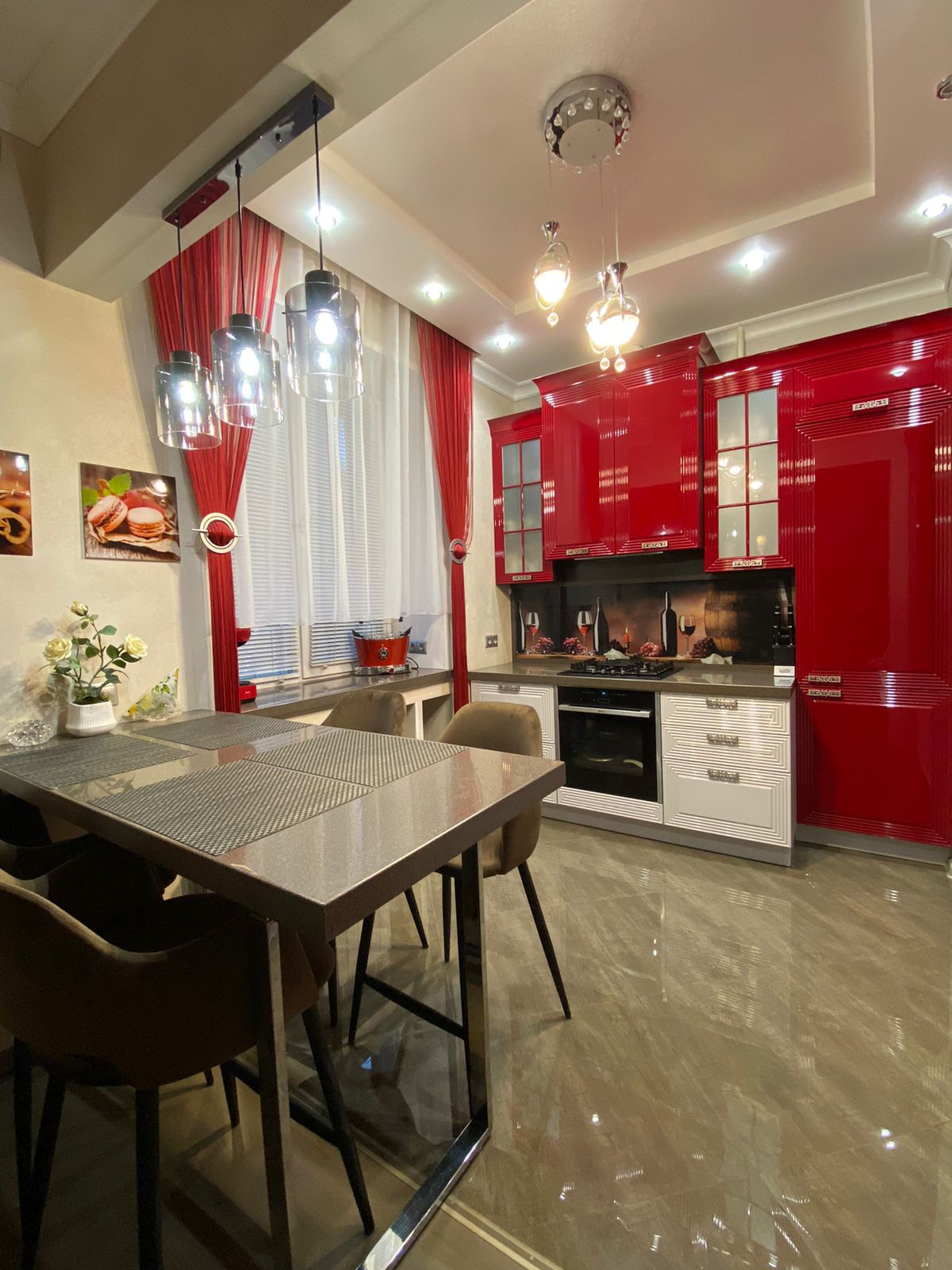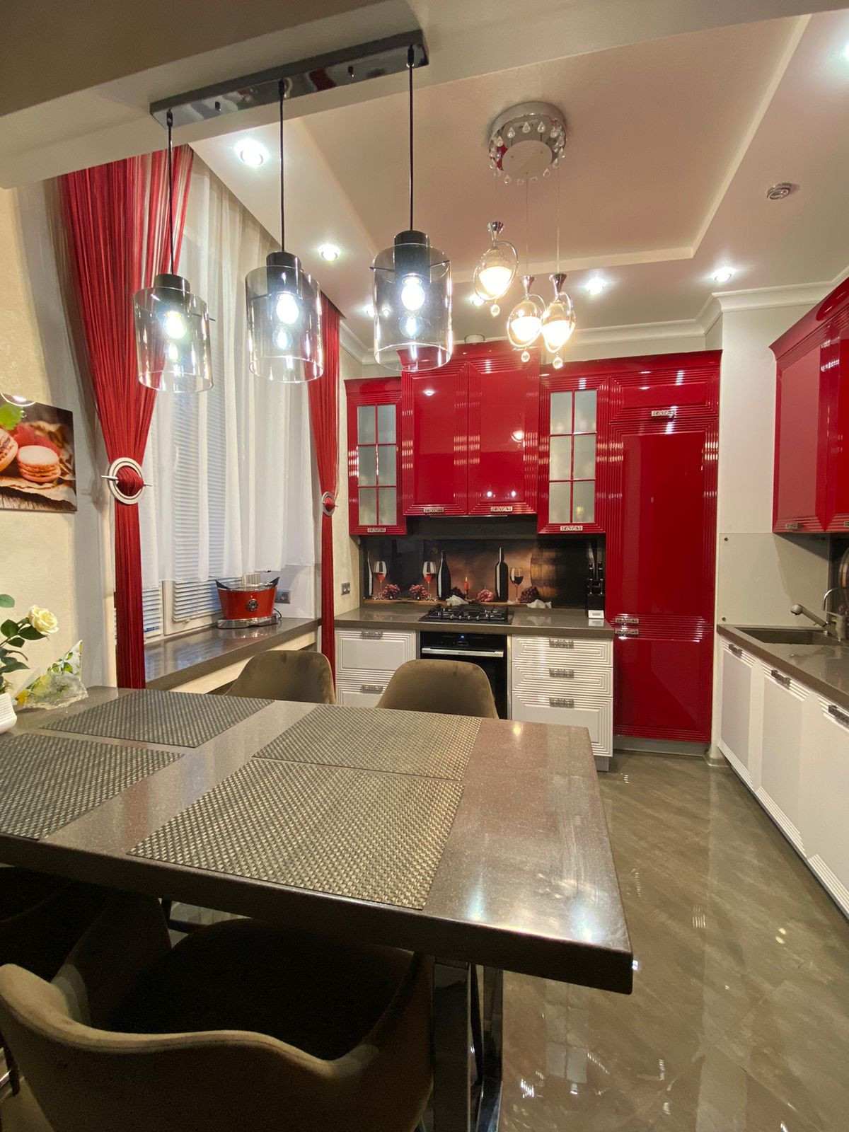 Кухонный гарнитур изготавливался под заказ, с встроенной техникой (посудомоечная машина, холодильник, духовой шкаф, варочная панель, микроволновая печь, вытяжка). Есть небольшая кладовка для хранения.
