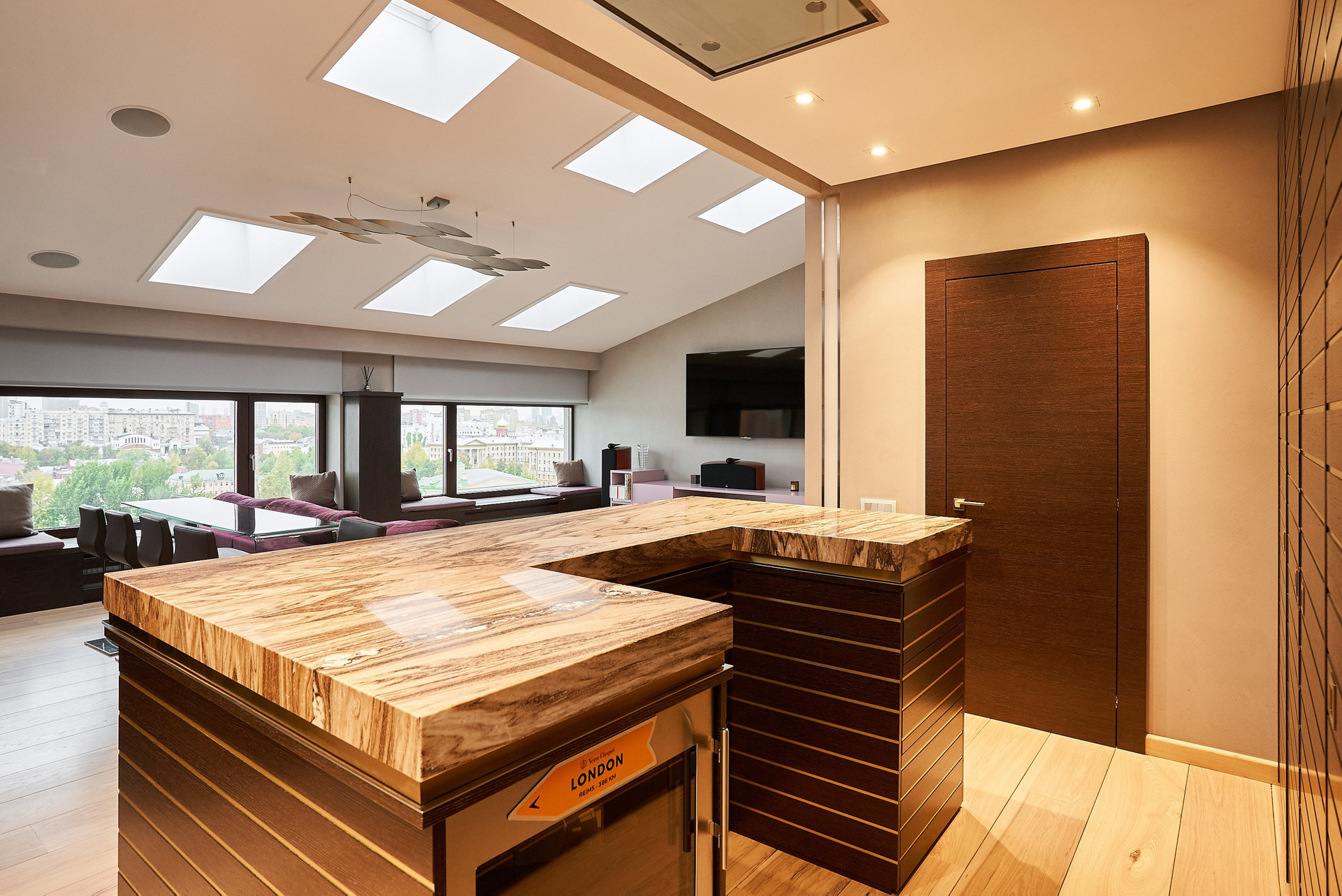 - Кухня оборудована встроенной техникой, включая винный шкаф и кофемашину.