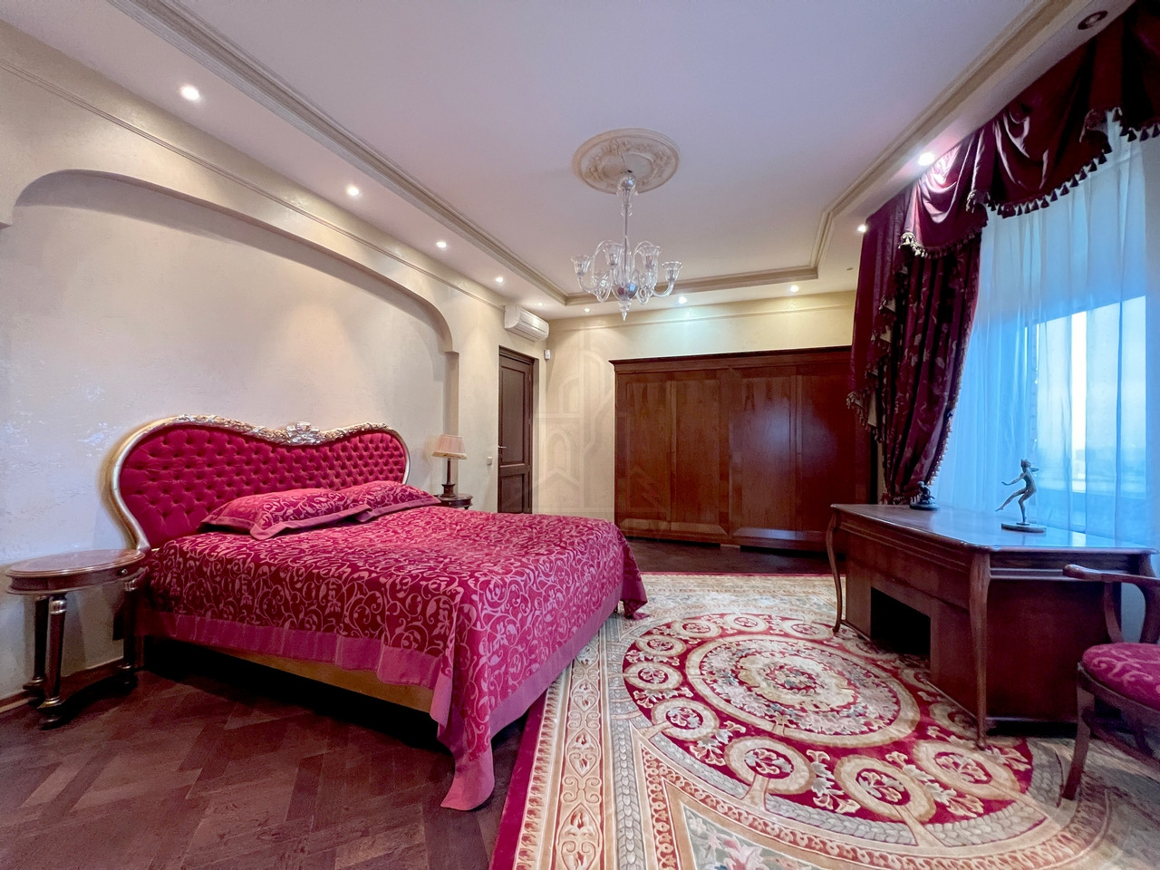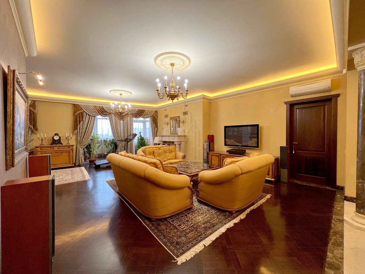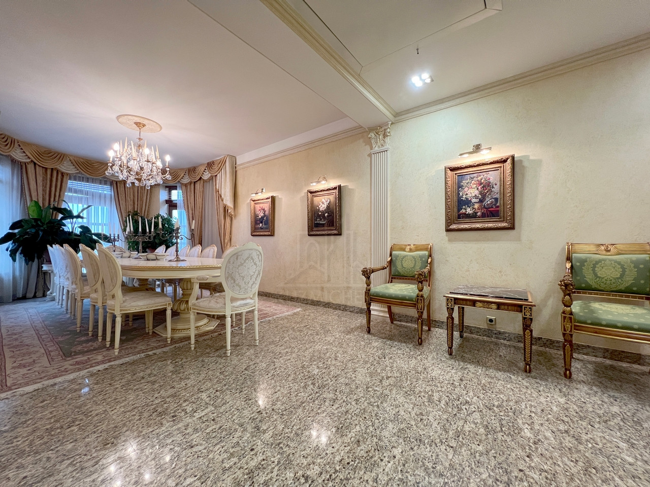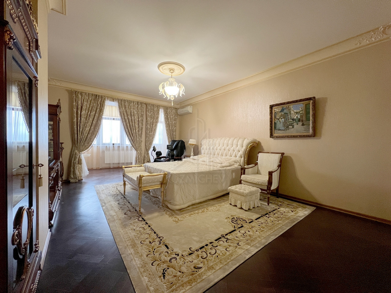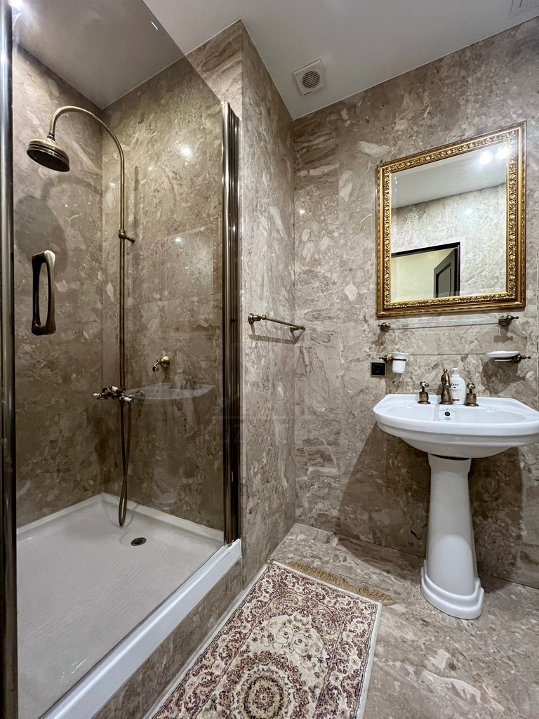 Квартира полностью меблирована эксклюзивной мебелью и полностью укомплектована требуемой б/техникой премиум-класса, 7-и комнатная (5-6 спален и 4 с/у), общей площадью 400 кв.м., расположена на 23/23 монолитно-кирпичного дома 2002 г.п. с п/паркингом, высота потолка 3 м.