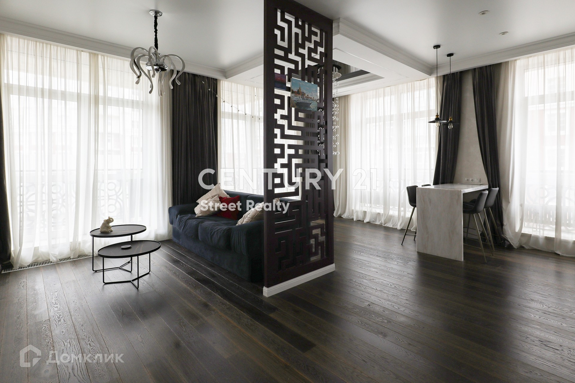 Пять панорамных окон наполняют пространство светом. Высота потолков 3.25 м.