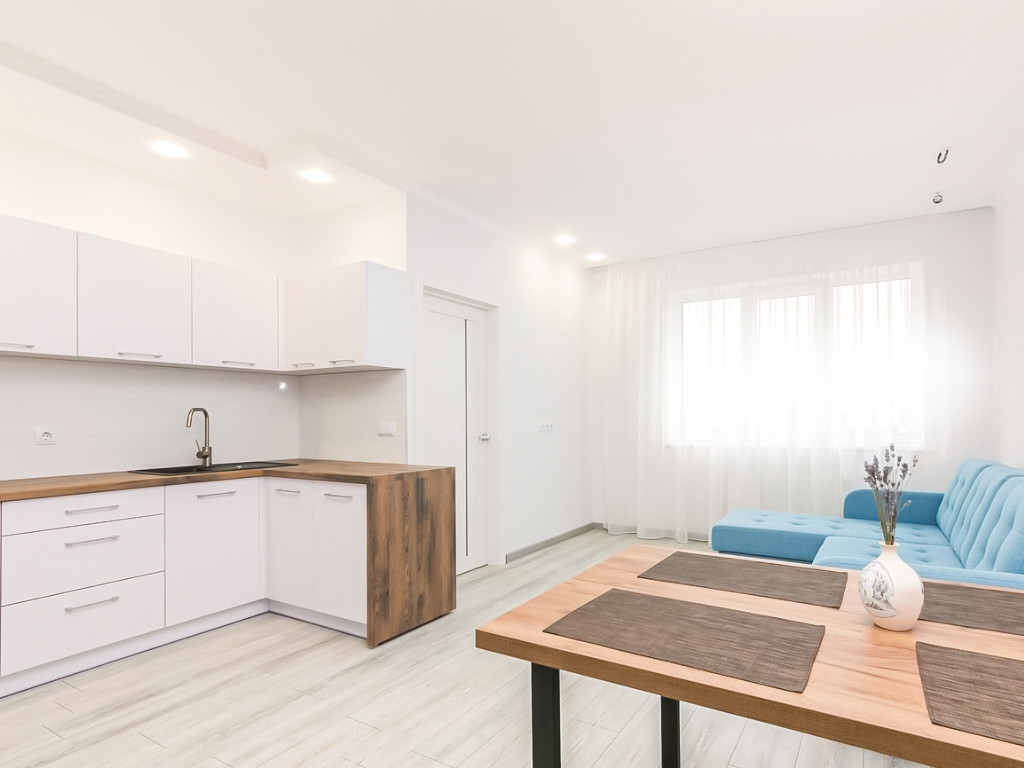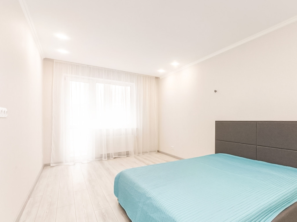 Расположена на 11-м этаже. Общая площадь – 53,80 кв.м. Удобная планировка: комнаты изолированные, большая лоджия, окна выводят в город, санузел совмещенный. В квартире сделан качественный евроремонт – в холле и санузле – керамогранит, в комнатах – ламинат; везде натяжные бесшовные потолки; на стенах поклеены обои. Установлена кухня и шкафы. Квартира не требует ни каких вложений в ремонт. Все новое.