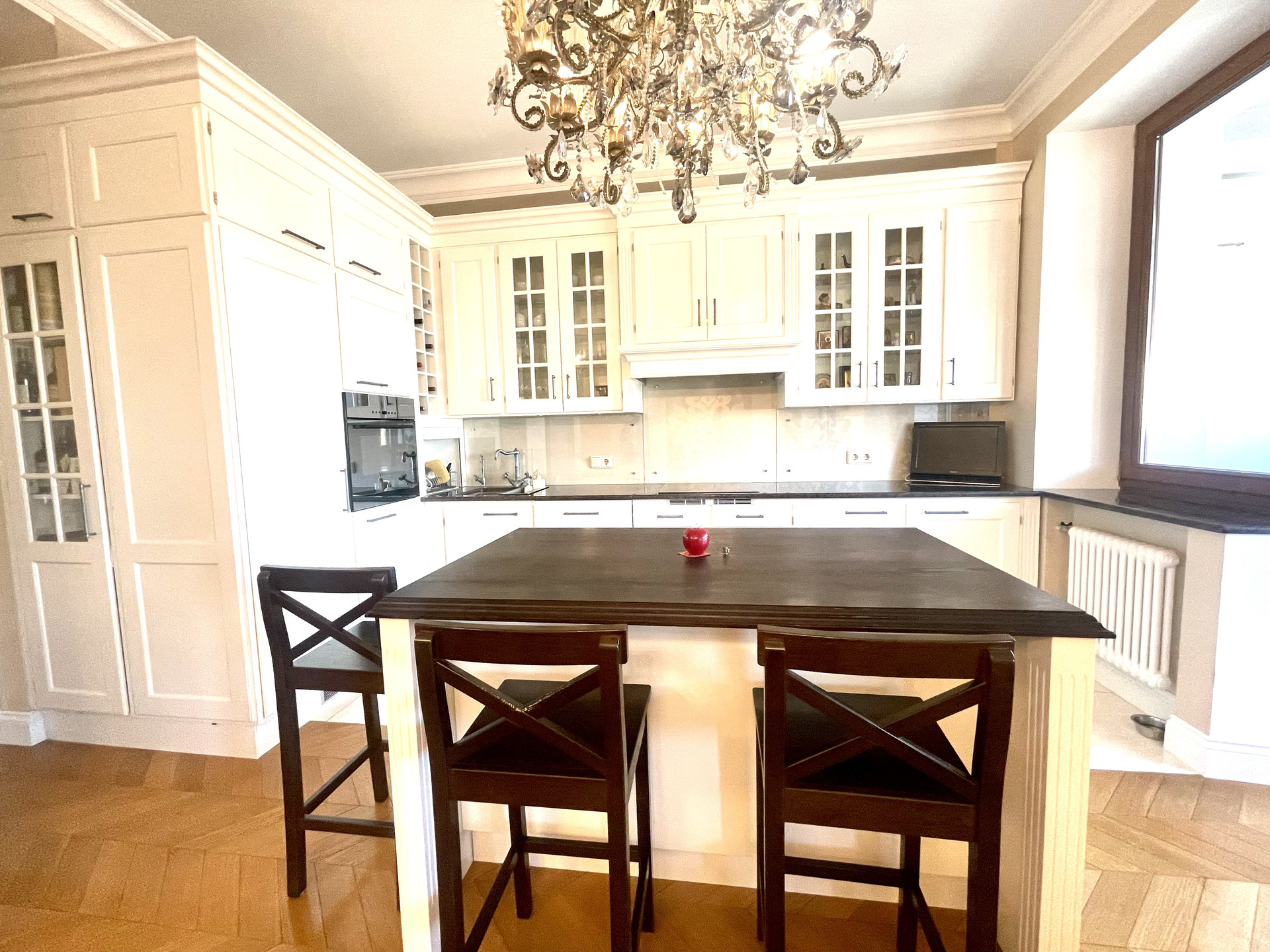 Свободная продажа! Один взрослый собственник с момента постройки дома-  ДДУ. Квартира в доме бизнес класса. Подземный паркинг (в стоимость не входит), огороженная территория.  Квартира распашной планировки:  кухня и гостиная на одну сторону дома, две спальни на другую сторону.  Лоджии  просторные с панорамными видами из кухни, гостиной и спальни. Два санитарных узла, постирочная. Большая  прихожая со встроенными шкафами.  Кухонная мебель Kvnum производства Дания. Единая столешница из натурального гранита. Встроенная техника. Пол - штучный дубовый паркет, французская елка. Сантехника: Devon&Devon и Villeroy&Boch. Все Окна и остекление лоджий из деревянных стеклопакетов, изготовленных в Германии. Дом расположен в парковой зоне. Развитая инфраструктура в шаговой доступности: магазины, школы, садики, МГИМО. Благоустроенный двор.