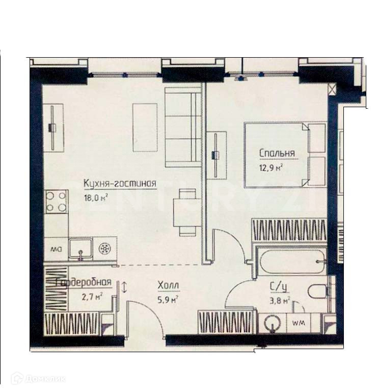 Планировкой предусмотрены: кухня-гостиная, спальня, сан. узел, прихожая со встроенным гардеробом. Выход на террасу из спальни и гостиной.