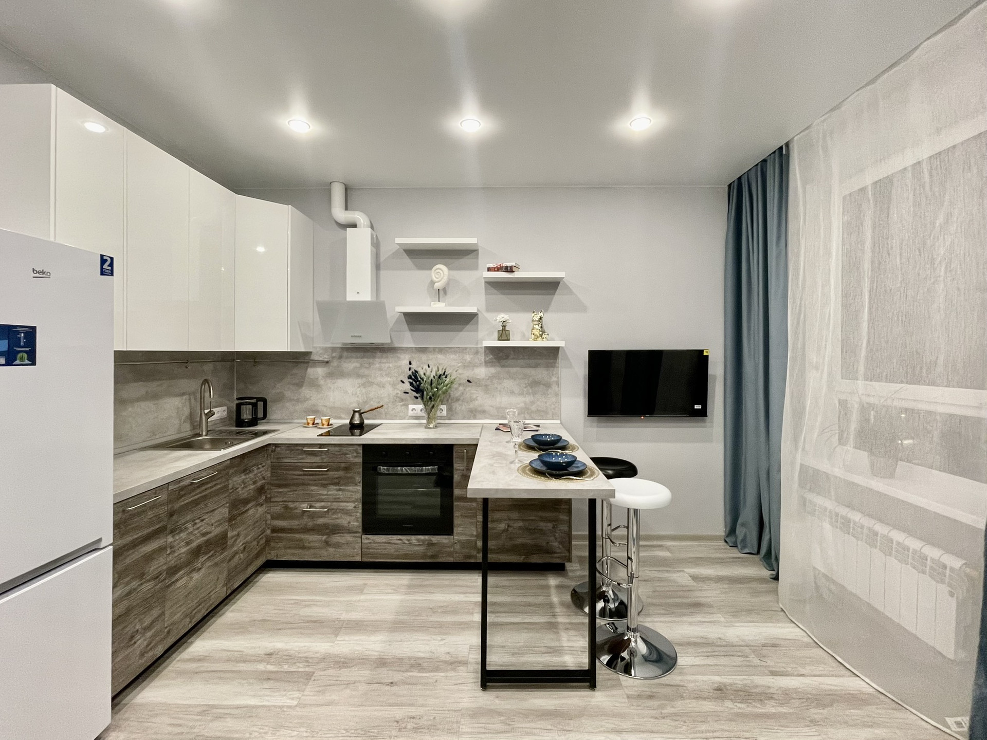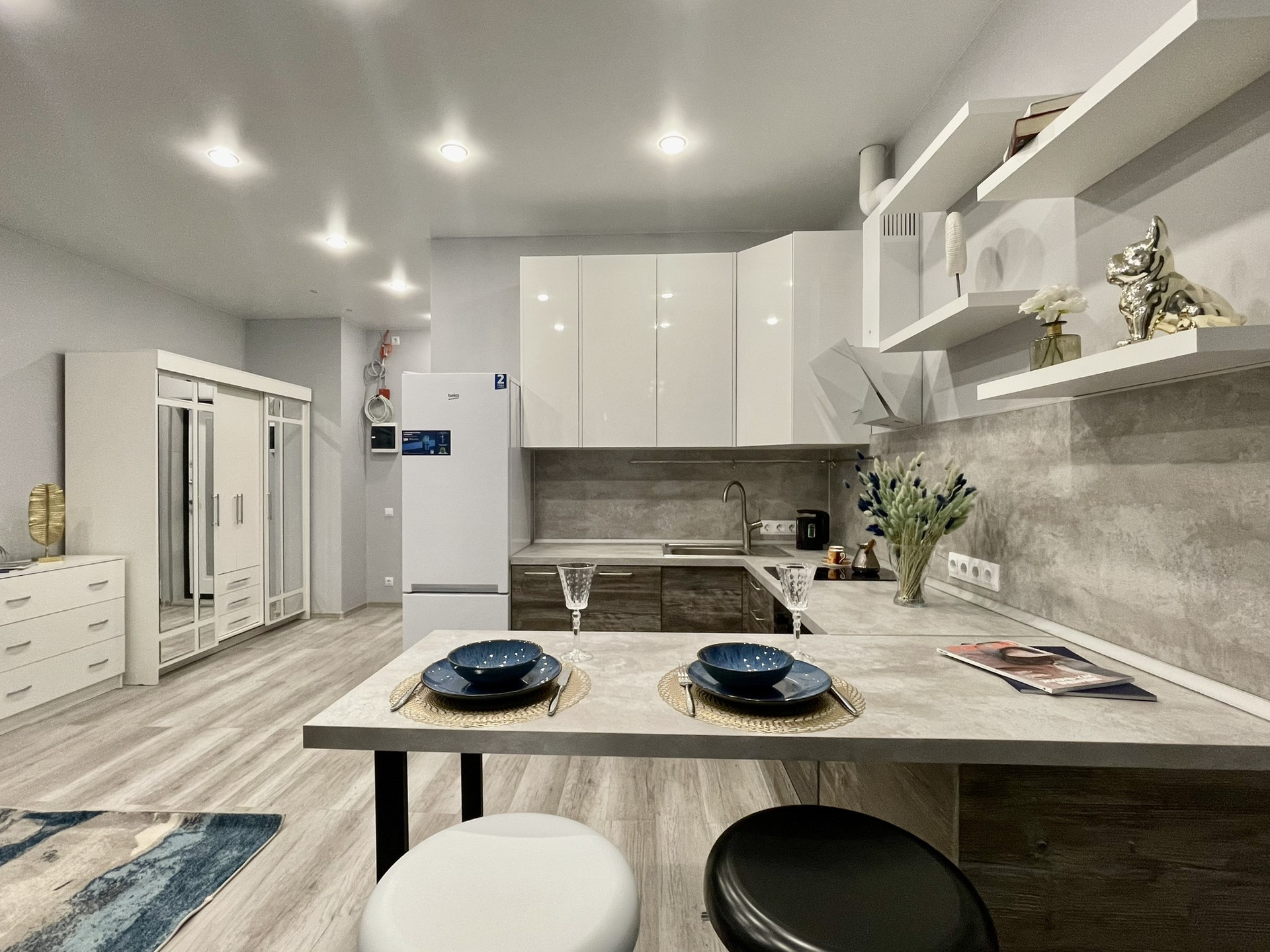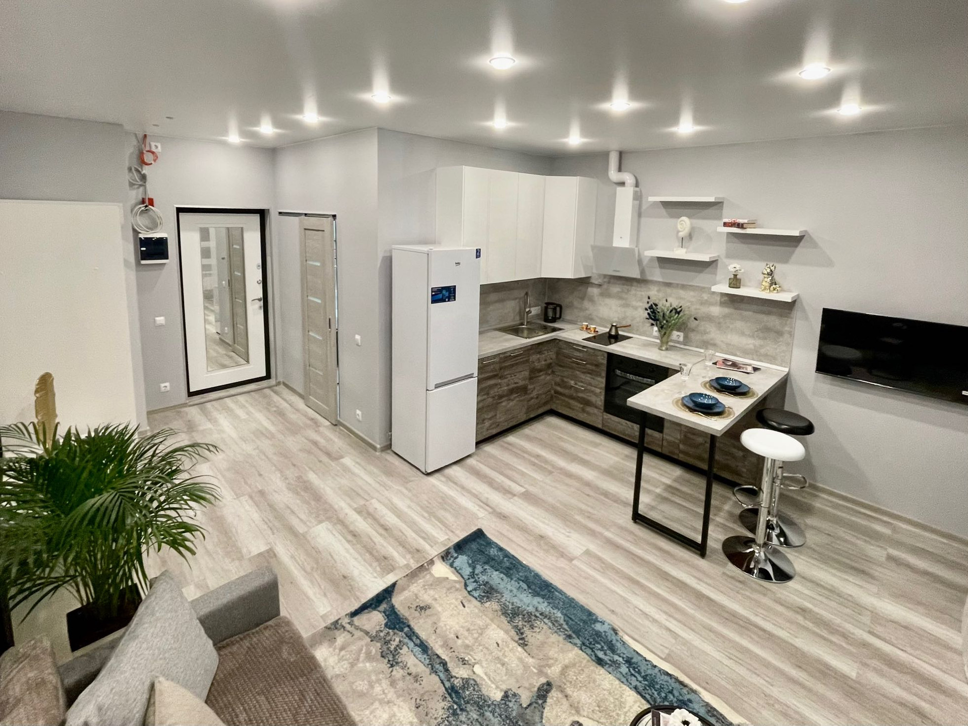 Студия, полностью меблирована и имеют всю необходимую бытовую технику для комфортного проживания: кондиционер, посудомоечную машину, холодильник, духовой шкаф, плиту для приготовления блюд.