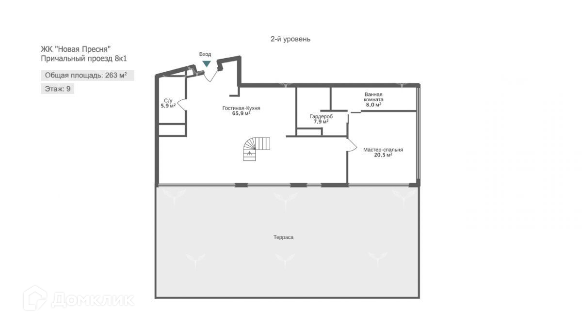 2й уровень:  гостиная с барной стойкой, мастер спальня с ванной и гардеробной комнатами, с.у ., приватная и просторная терраса с панорамными видами.