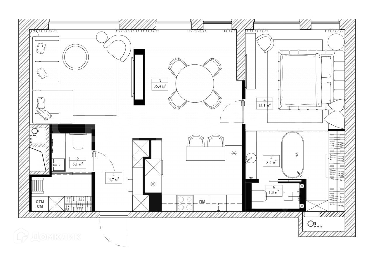 Планировкой предусмотрены: просторная кухня-гостиная, изолированная мастер - спальня с гардеробной, 2 сан. узла, прихожая с гардеробной.