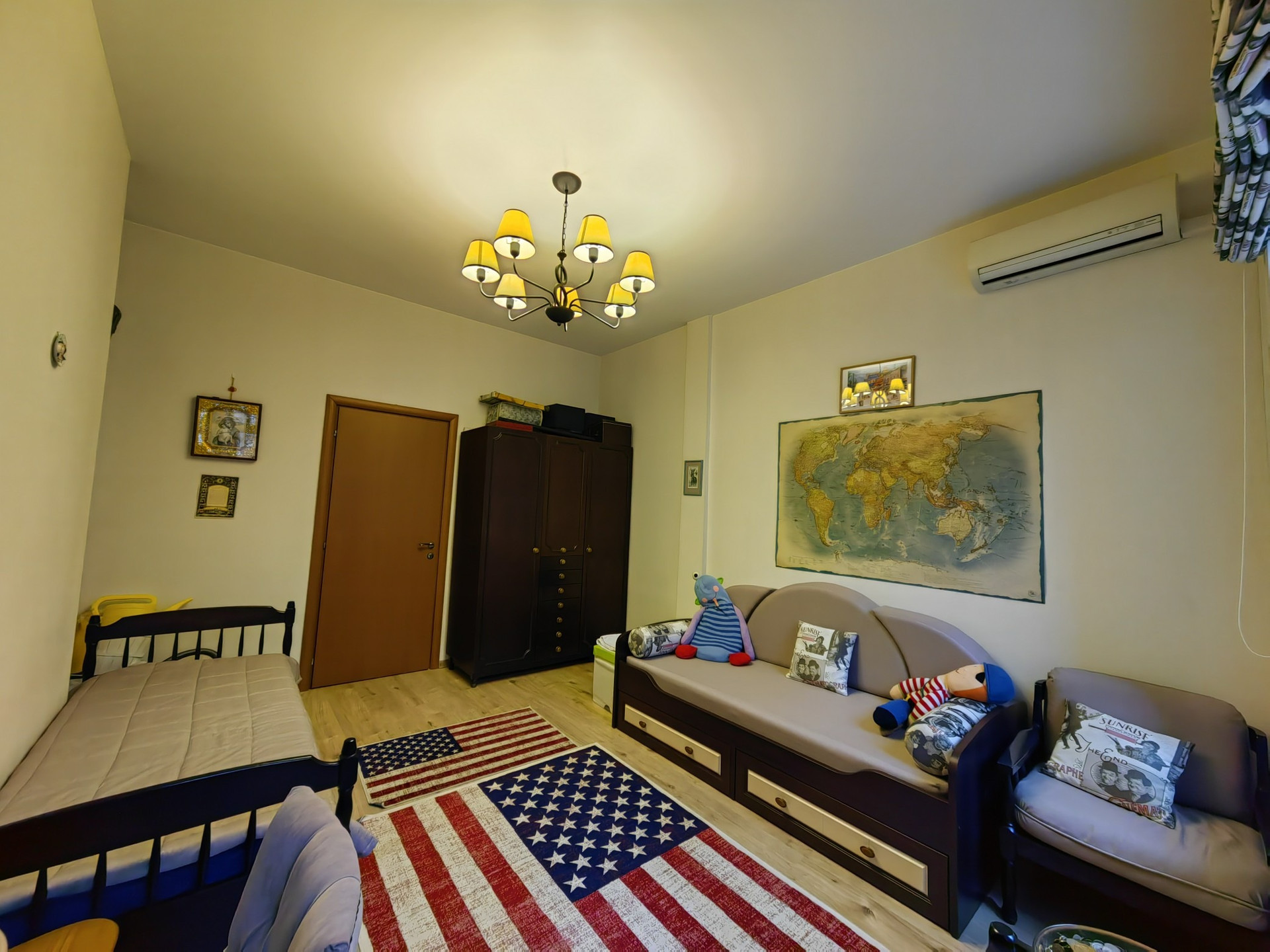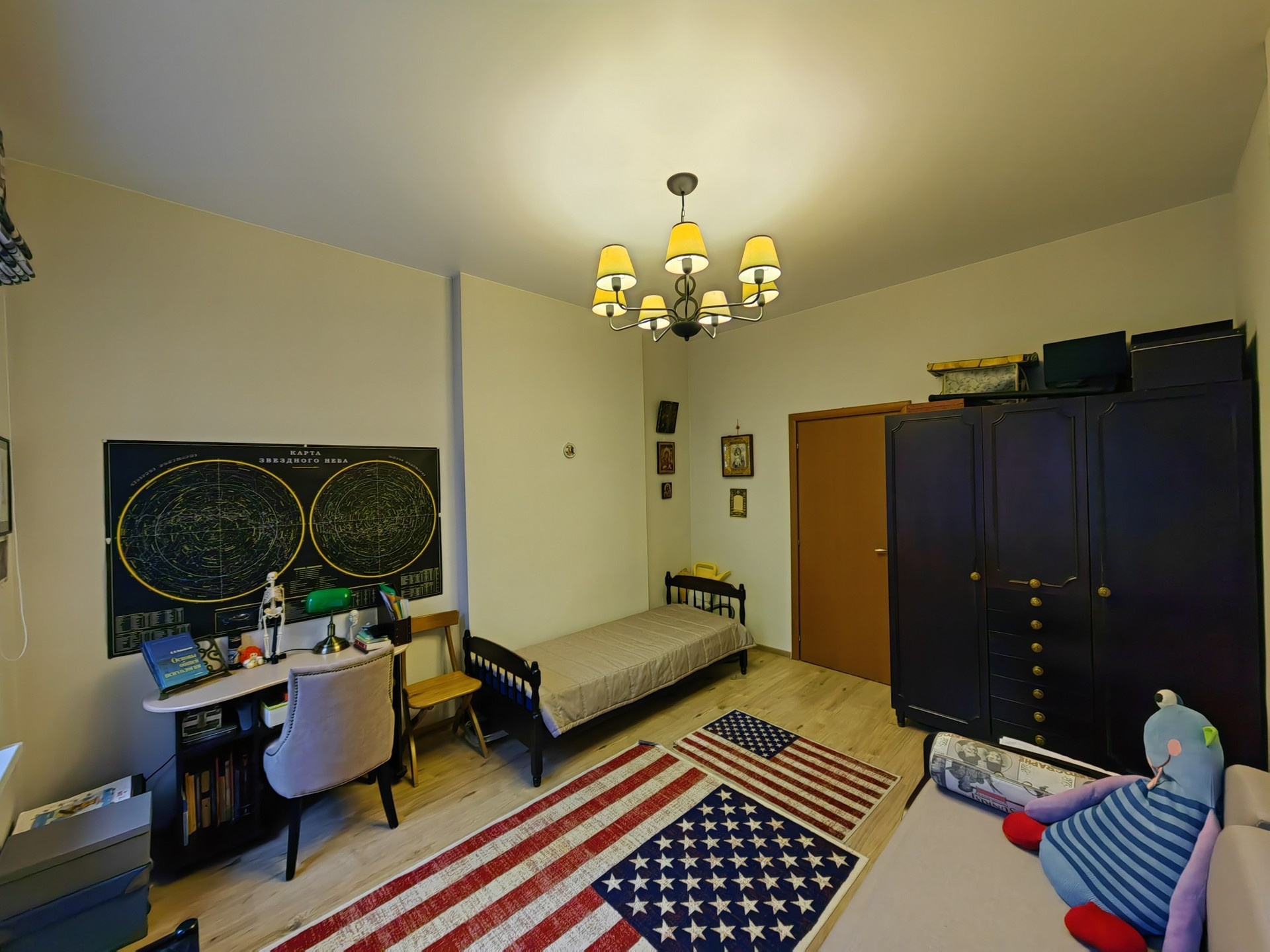 Планировка: детская + спальня + кухня-столовая + совмещенный сан узел.