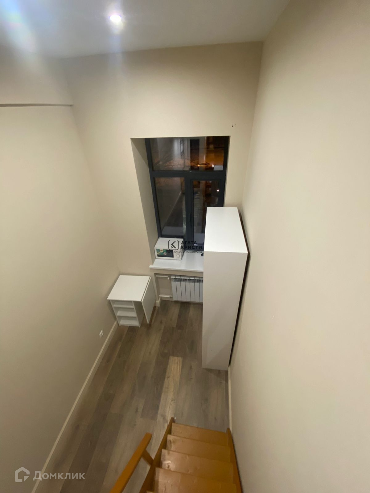 Большие окна, высокие потолки,  спальное место на втором этаже.