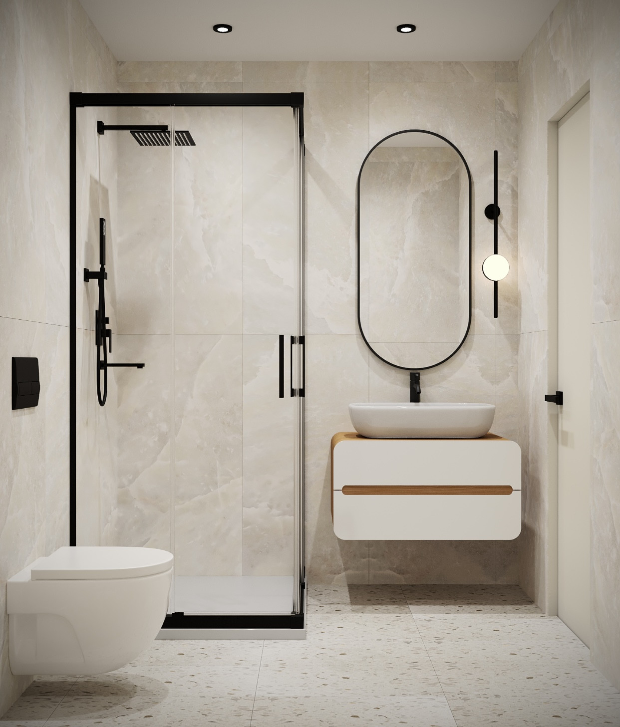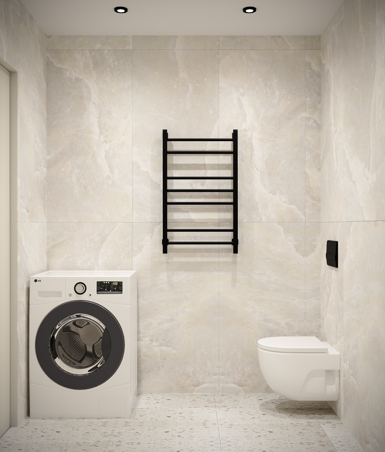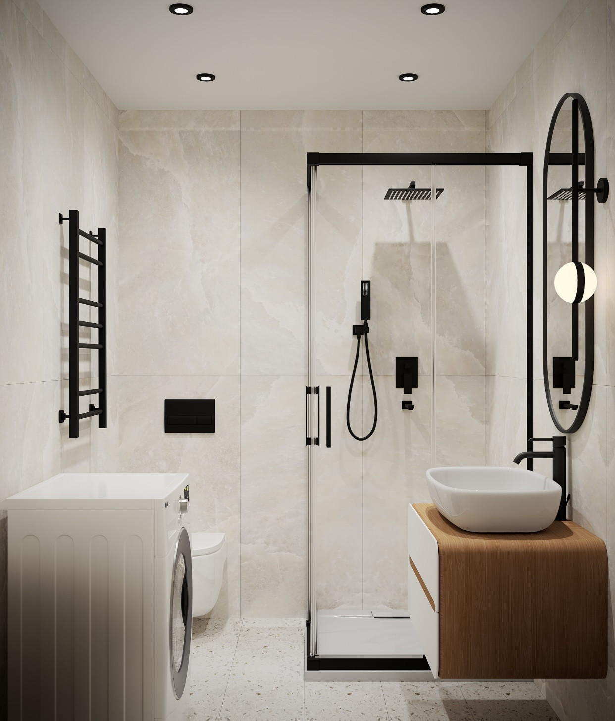 -просторный санузел с душевым ограждением, стильной тумбой с врезной раковиной, подвесной чашей с инсталляцией, качественной сантехникой стиральной машинкой топовой модификации Candy,