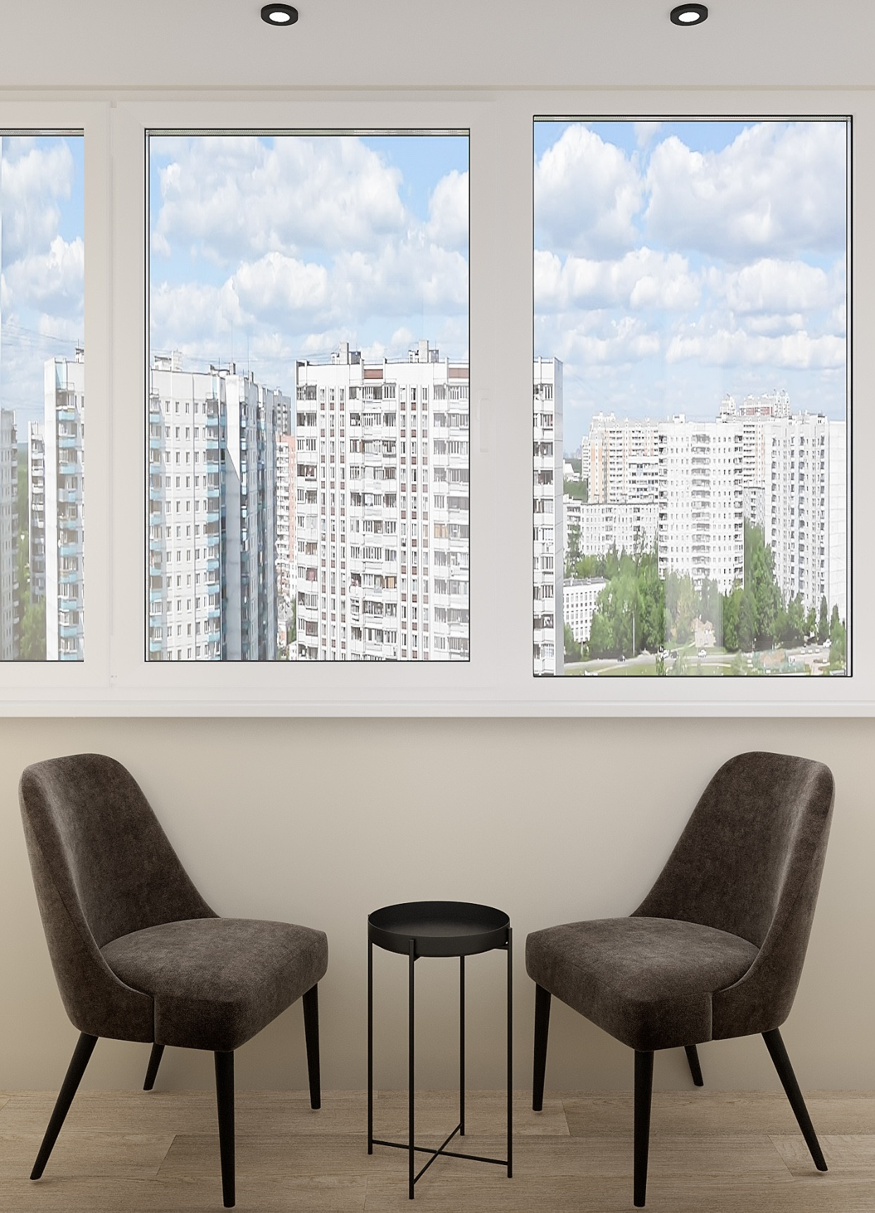 -обустроеная лоджия с зоной отдыха с креслом и столиком, чтобы насладится с чашечкой кофе видами, открывающимися с 8 панорамного этажа.