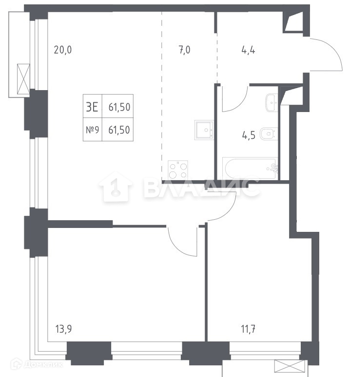 Общая площадь 61.5 м2