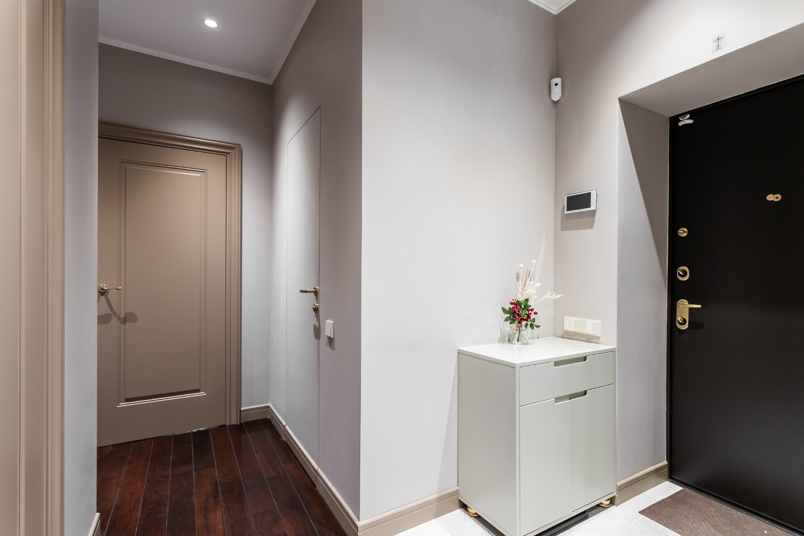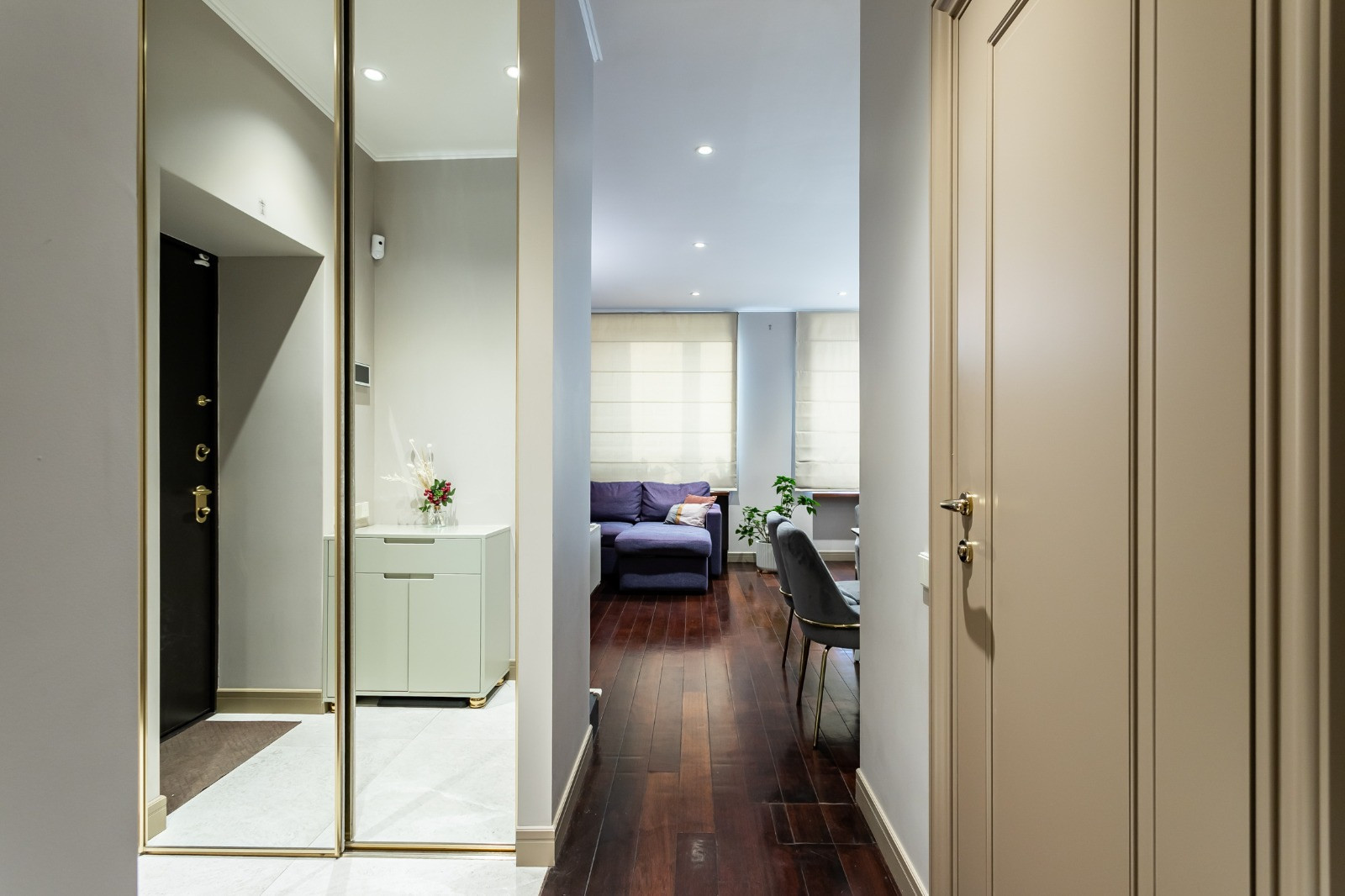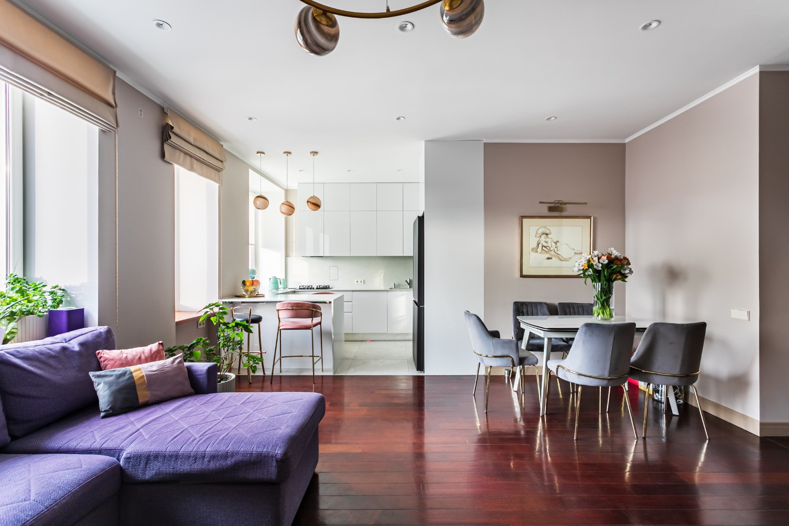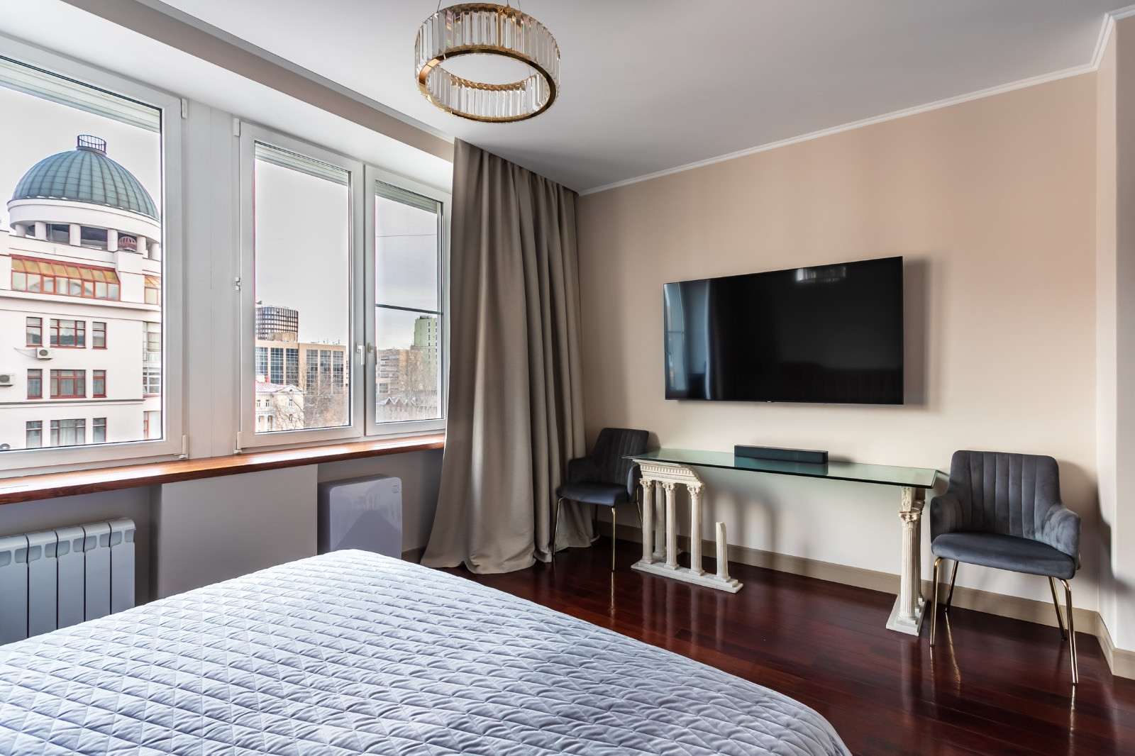 Вся площадь организована и продумана до мелочей: мастер-спальня с отдельным большим сан. узлом с ванной и гардеробной, детская комната, гостевой сан. узел с душевой кабиной, большая гостиная, объединённая с кухонной и столовой зоной, а также кладовая. Современный дизайнерский ремонт, с использованием качественных строительных материалов: паркет из красного дерева, итальянская плитка в сан. узлах.