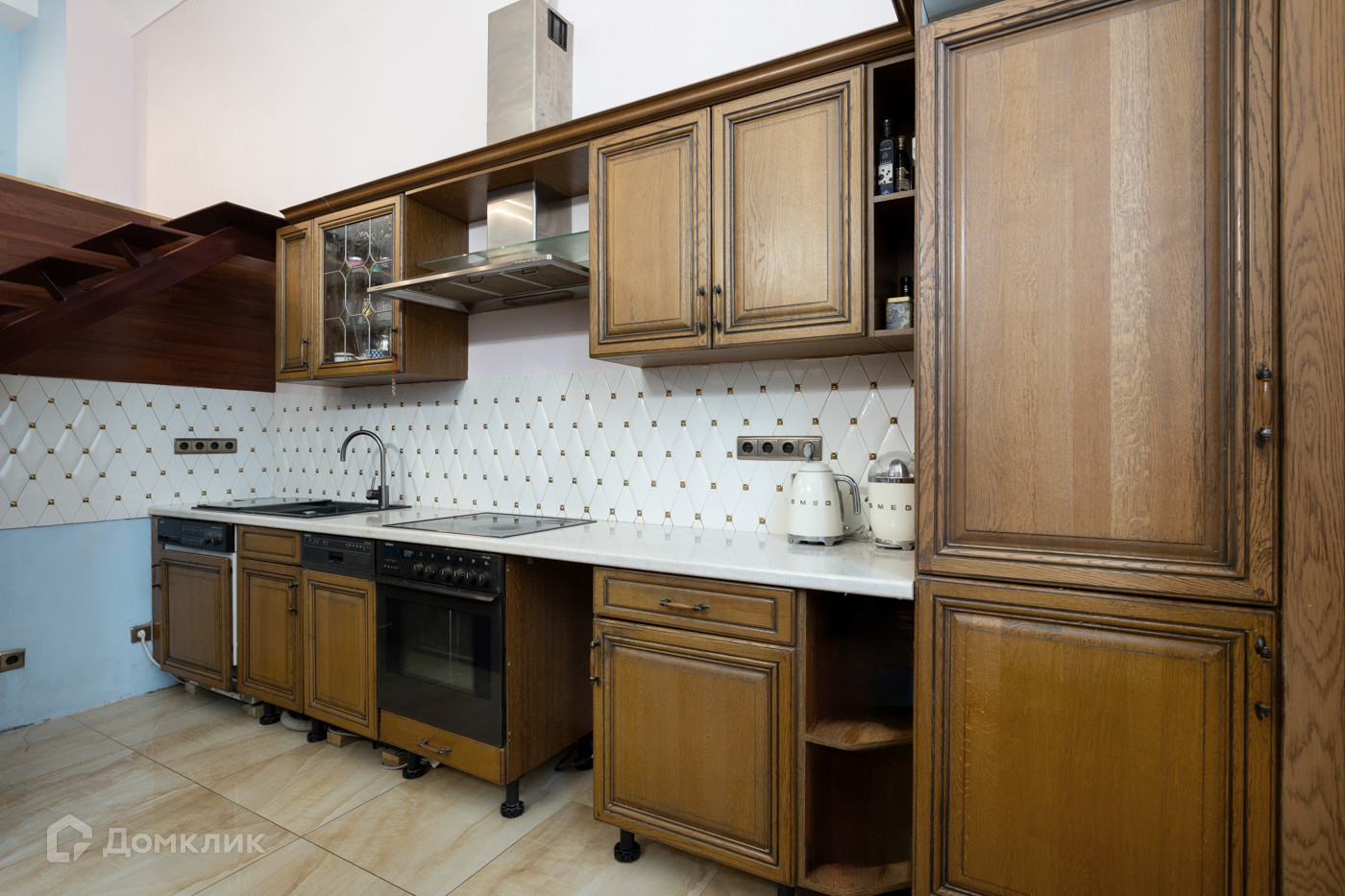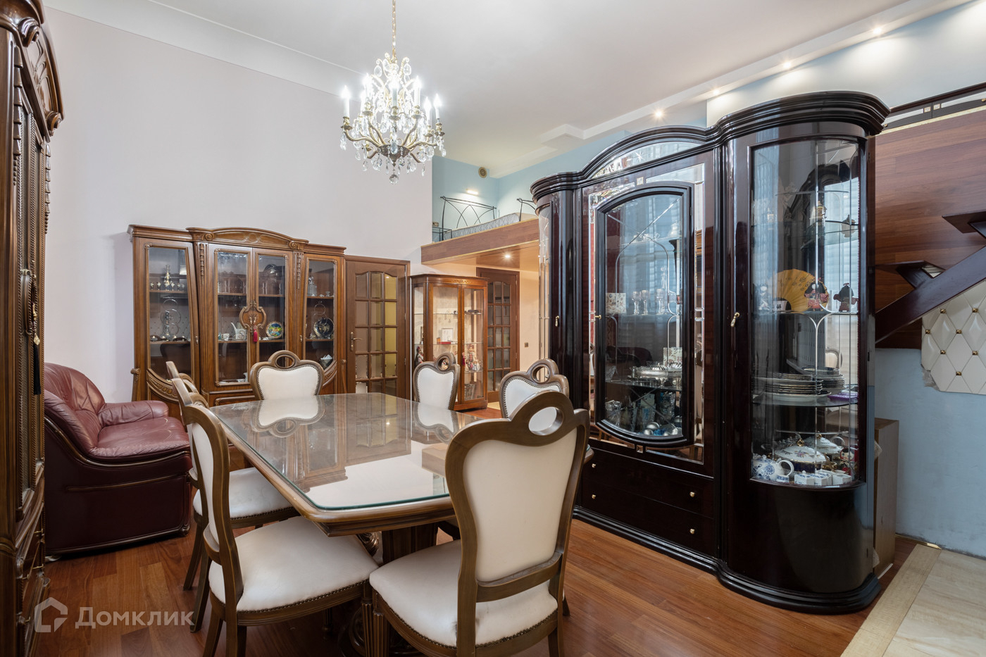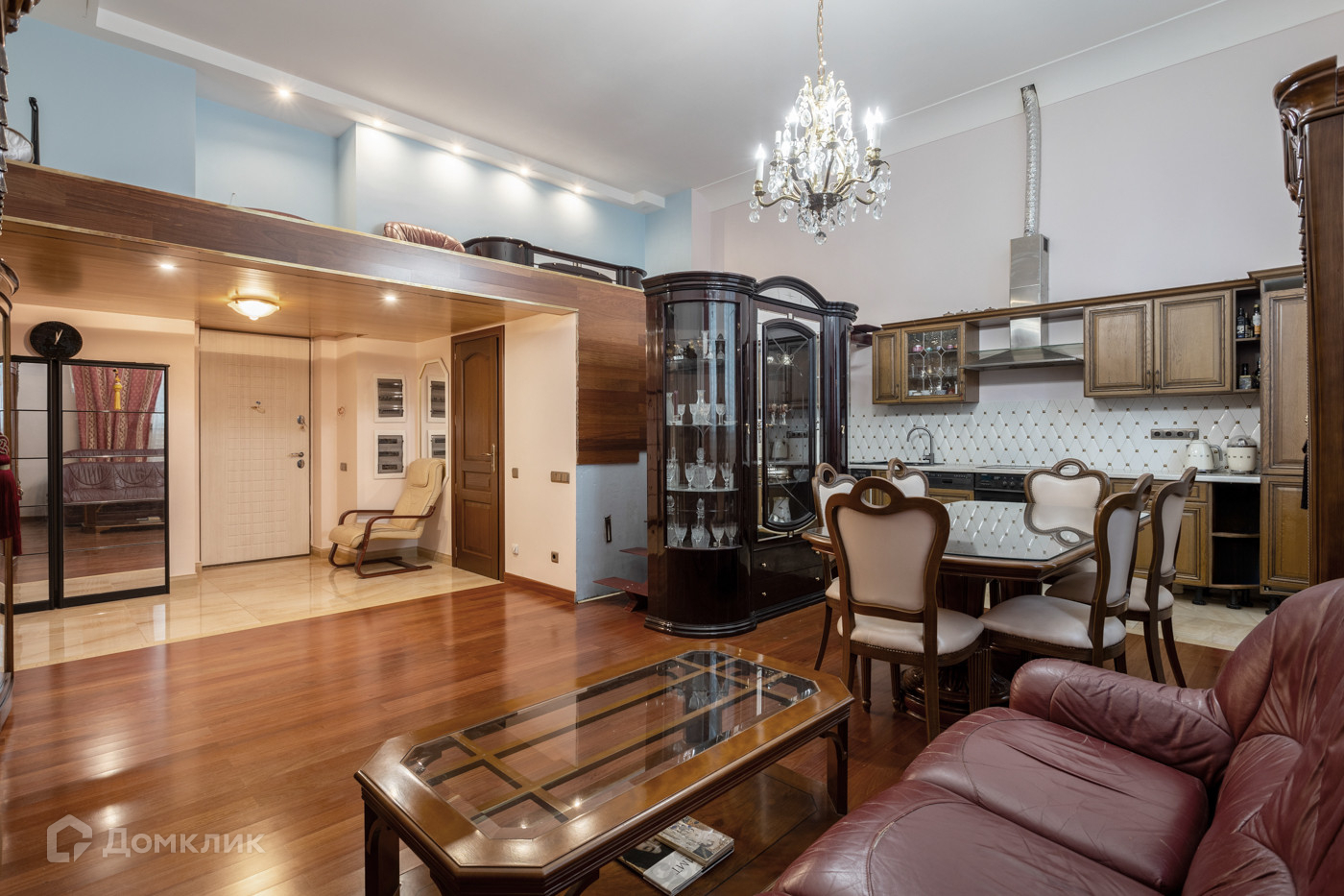 Кухня-гостиная: гостиная украшается элитной Итальянской мебелью Barnini Oseo и Drovandi. Журнальный стол испанской коллекции Art Mobile фабрики Ofifran, гармонично вписывается в интерьер. Обеденная группа, состоит из стола и 6 стульев, ее окружают пристенные витрины Rondo Италия, немецкая кухня выполнена в классическом стиле, фартук Aden Rombux.