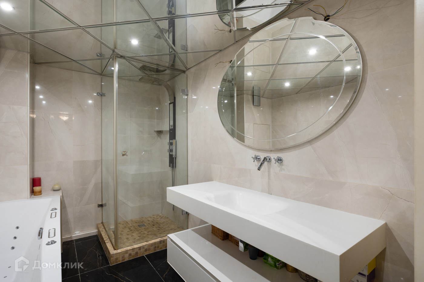 С.у: Отделка пол и стены из мрамора Gardenia Orhidea Италия, вся сантехника премиальных Итальянский брендов, раковина Antonio Lupi, душевая колонна и кабина Visantin, унитаз биде Artceram jass, Джакузи Mausbegger jUCunda , длинна 190 на 99 см. По всей квартире, где уложен керамогранит, подогрев пола. Все двери в квартире J.Gorafol-Италии.