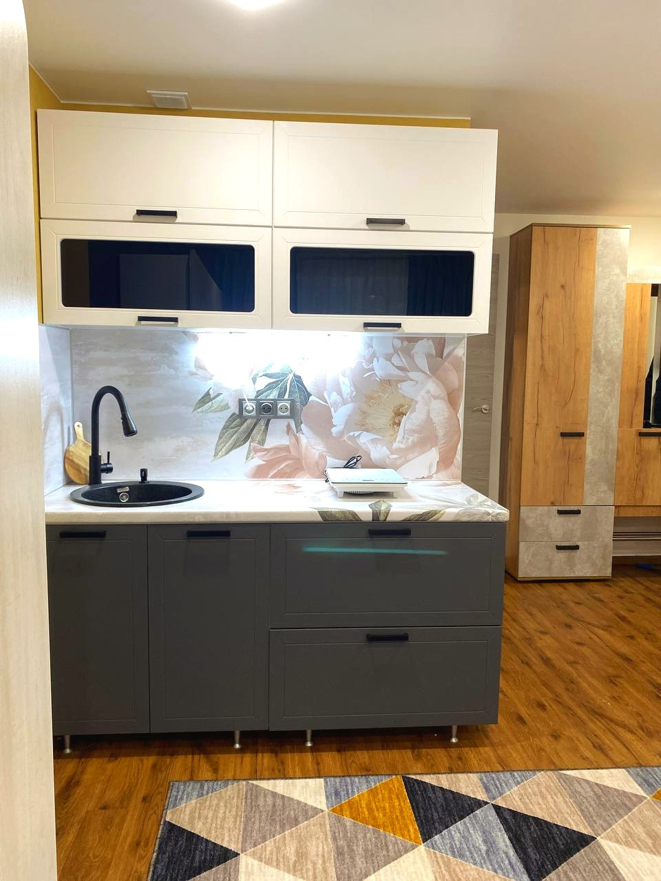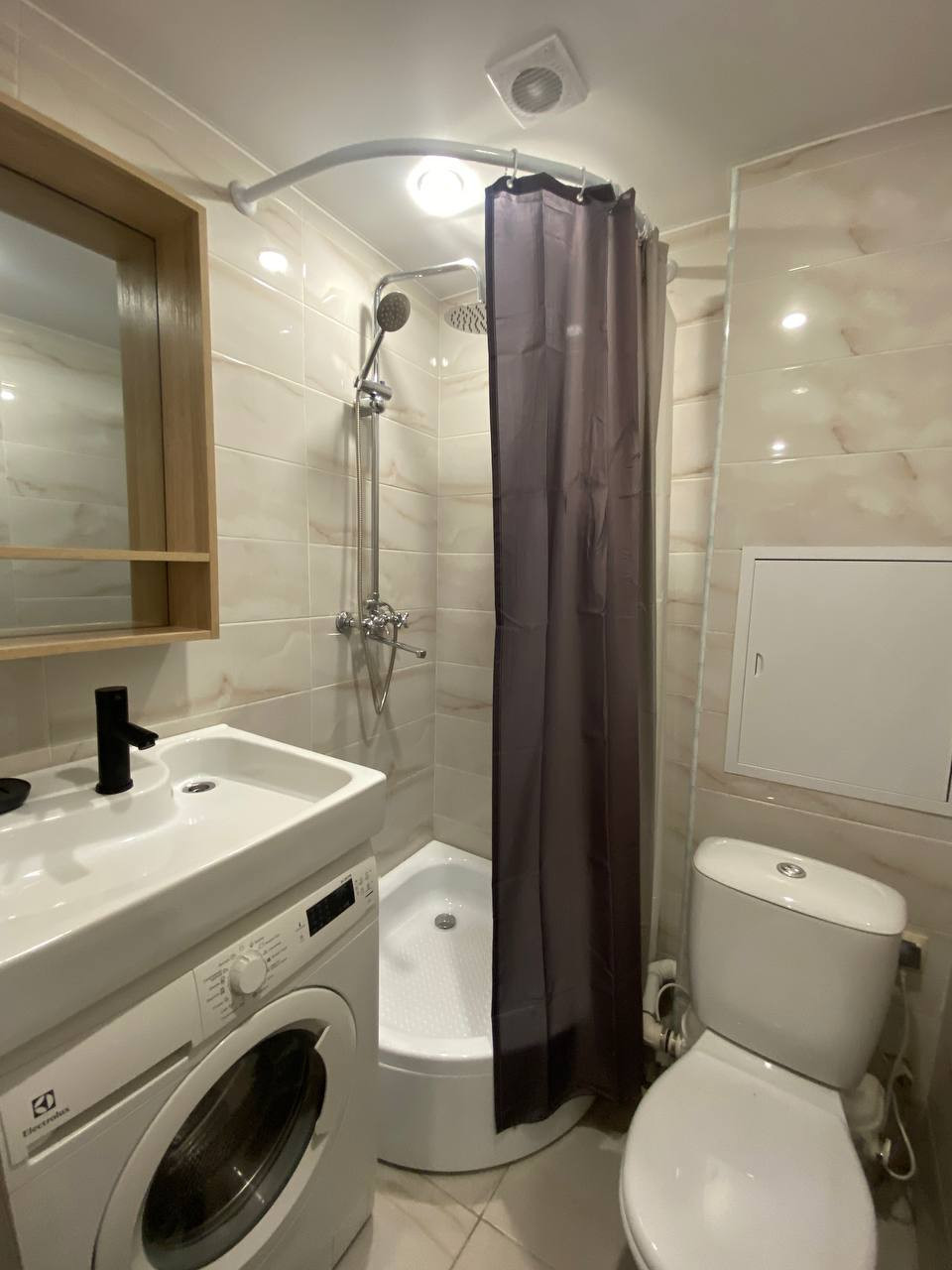Студия укомплектована мебелью, бытовой техникой, кухонной мебелью, всё новое.Фото реальные, заходи и живи.