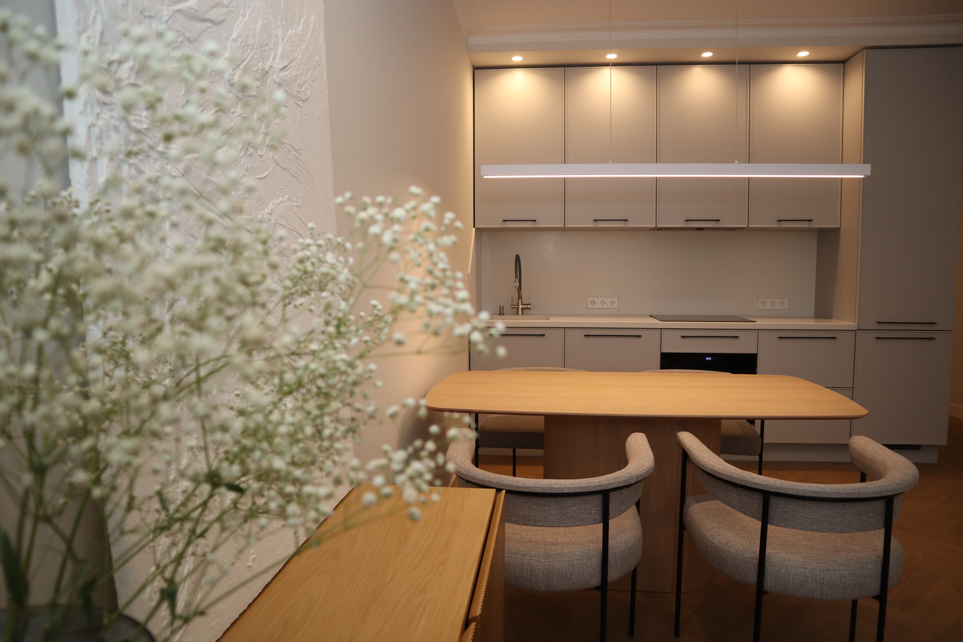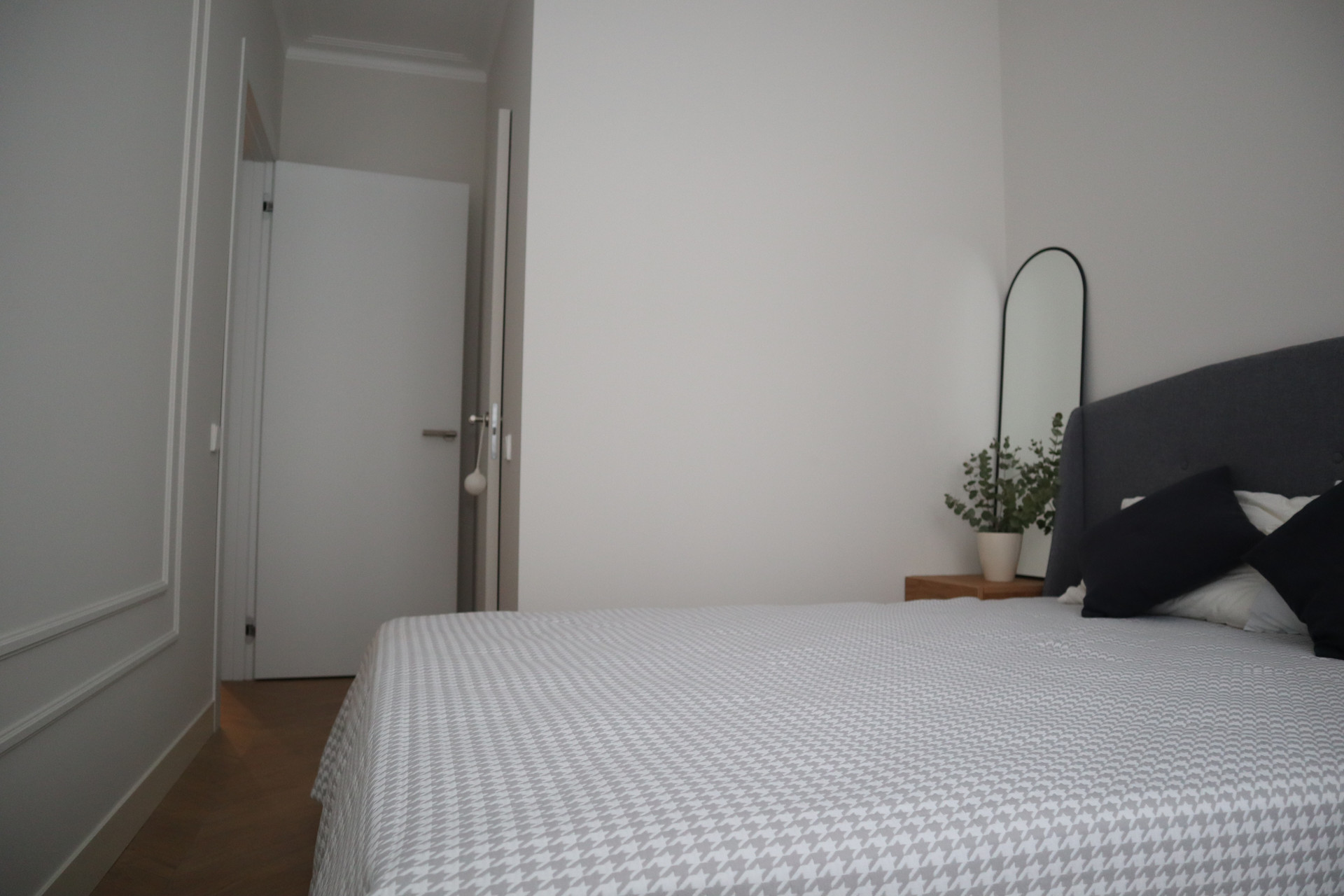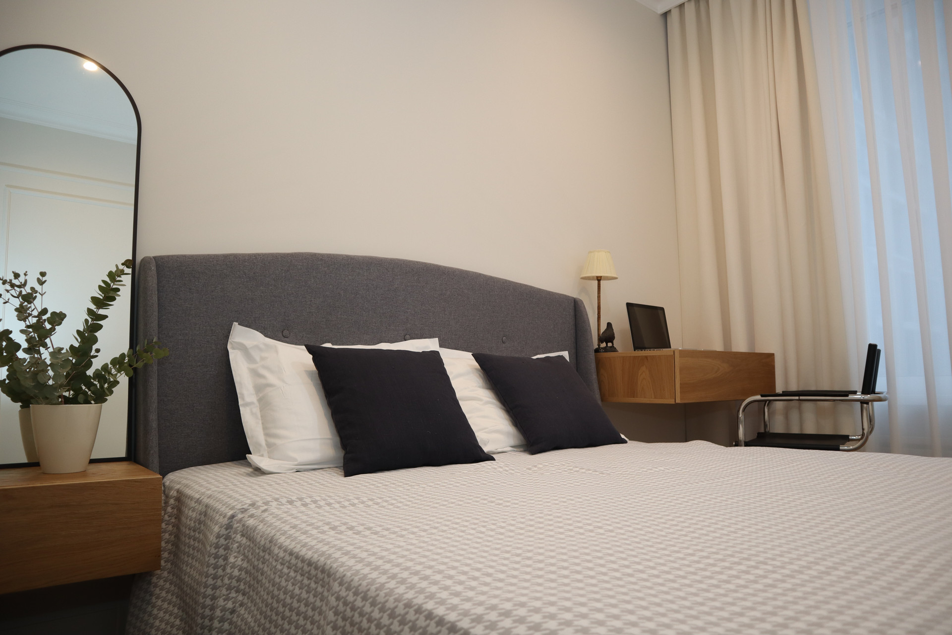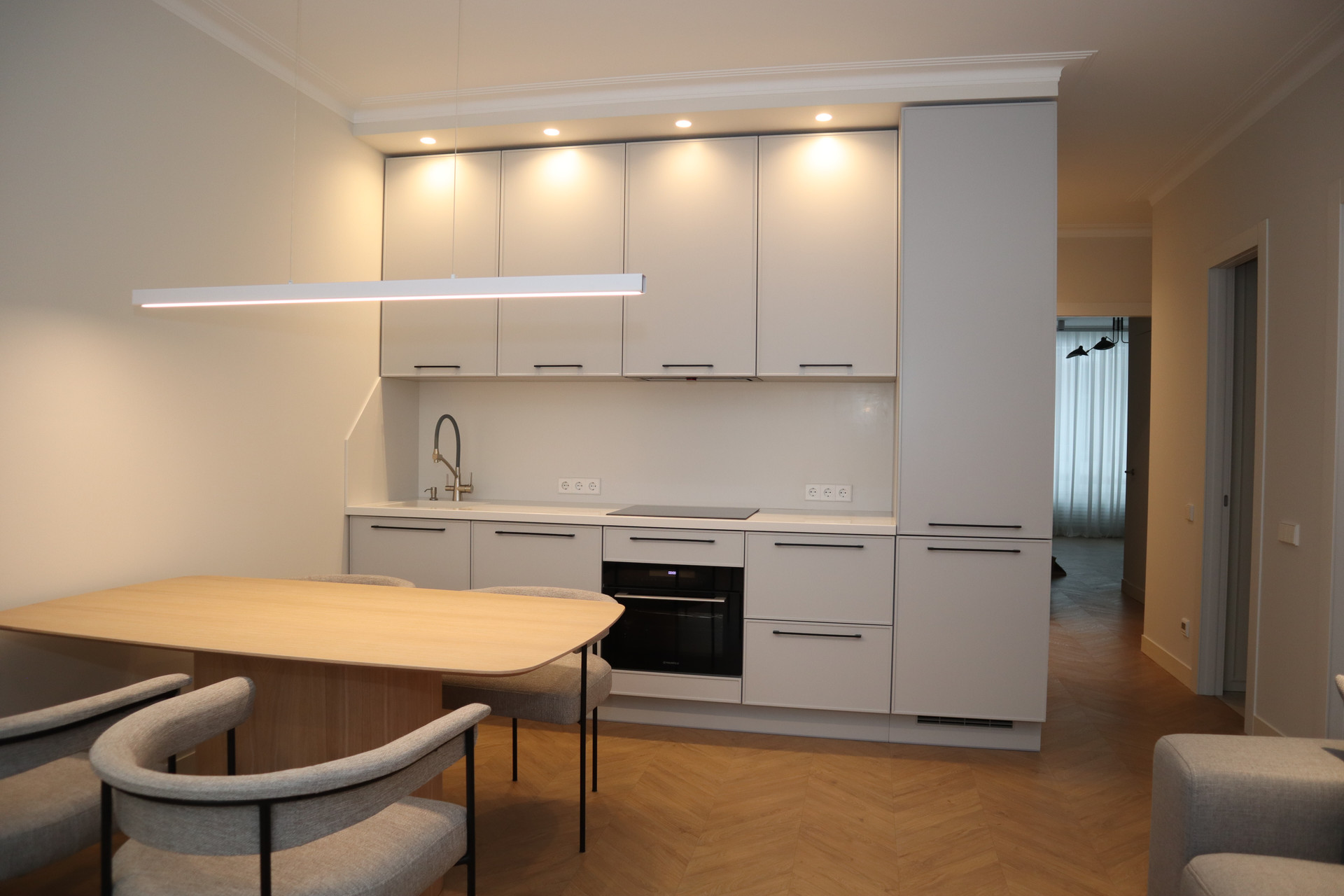 В квартире выполнена грамотная планировка: большая кухня-гостиная с встроенной кухней (20 м²) и бытовой техникой и 2 изолированные спальни (18 м² и 11 м²), в каждой комнате гардеробная, с/у раздельный.