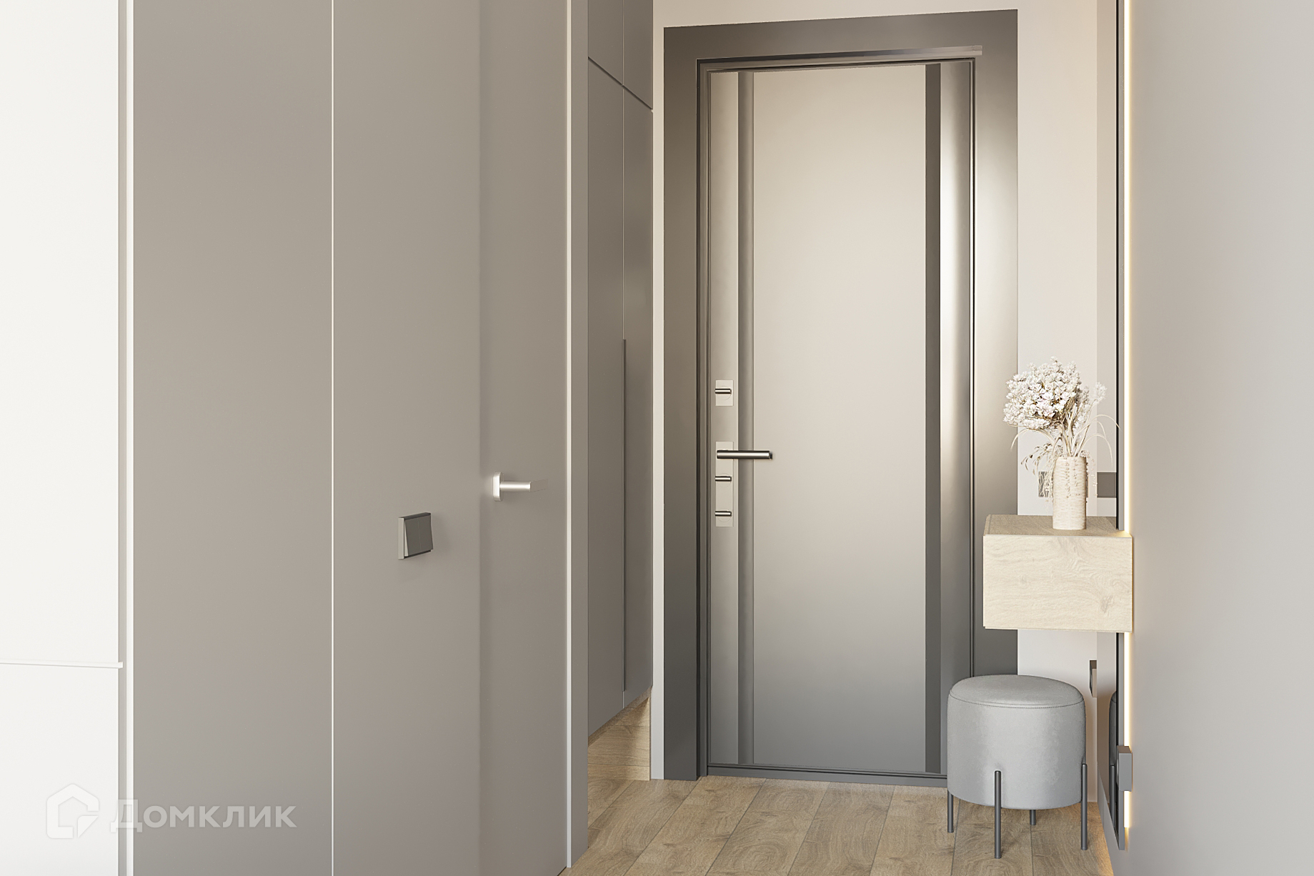 Прихожая: Шкафы под потолок обеспечивают много места для хранения. Также идеальным решением было сделать зеркало на дверной панели, что позволило сэкономить место.
