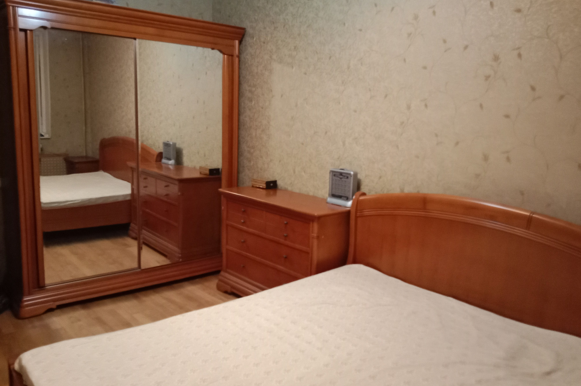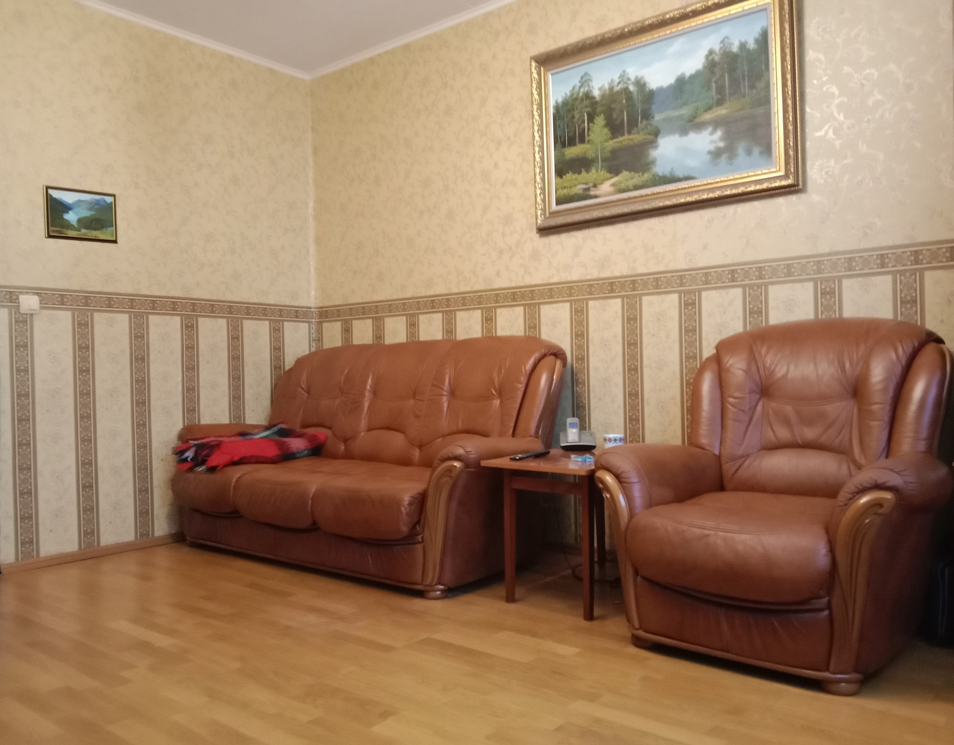 В гостиной кожаный диван и кресло, в спальне двуспальная кровать, шкаф, комод и тумбочки из массива дуба. Фасады кухни - массив, из техники: холодильник Атлант, плита и СВЧ Gorenje, кофемашина Nespresso.