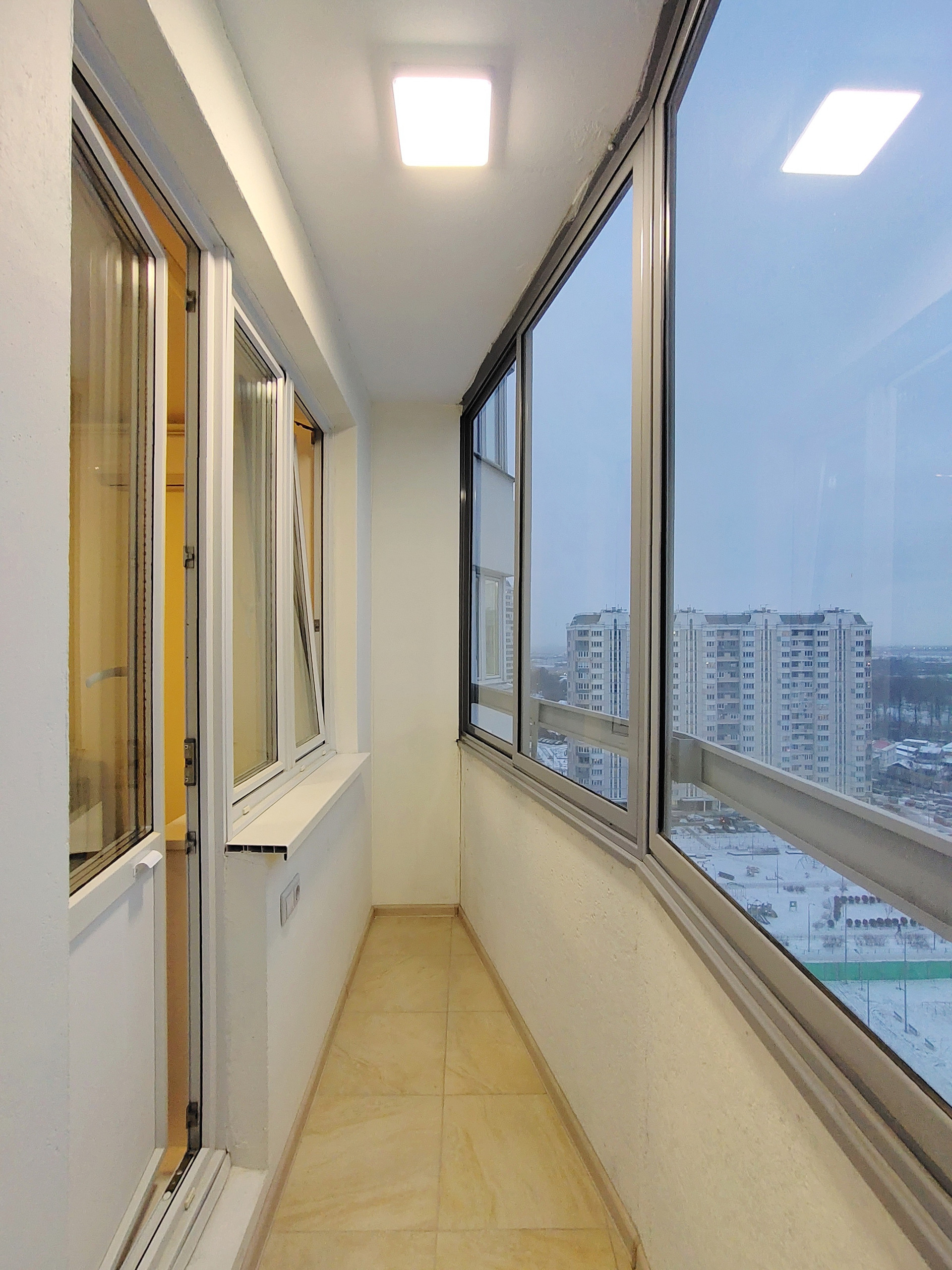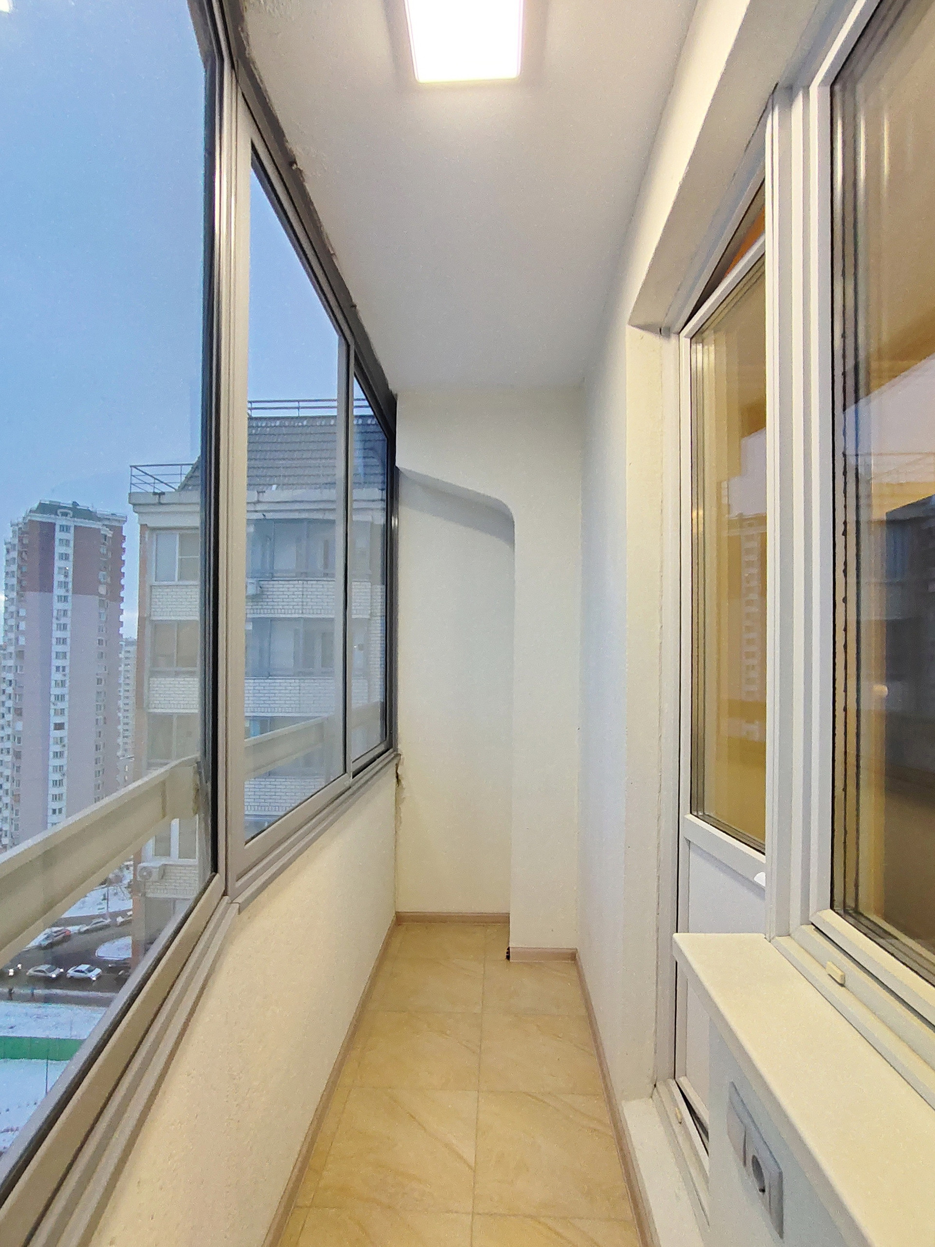 Чистая лоджия с ремонтом. Для вашего удобства на ней предусмотрено освещение и розетки. Застеклена и на полу лежит плитка.