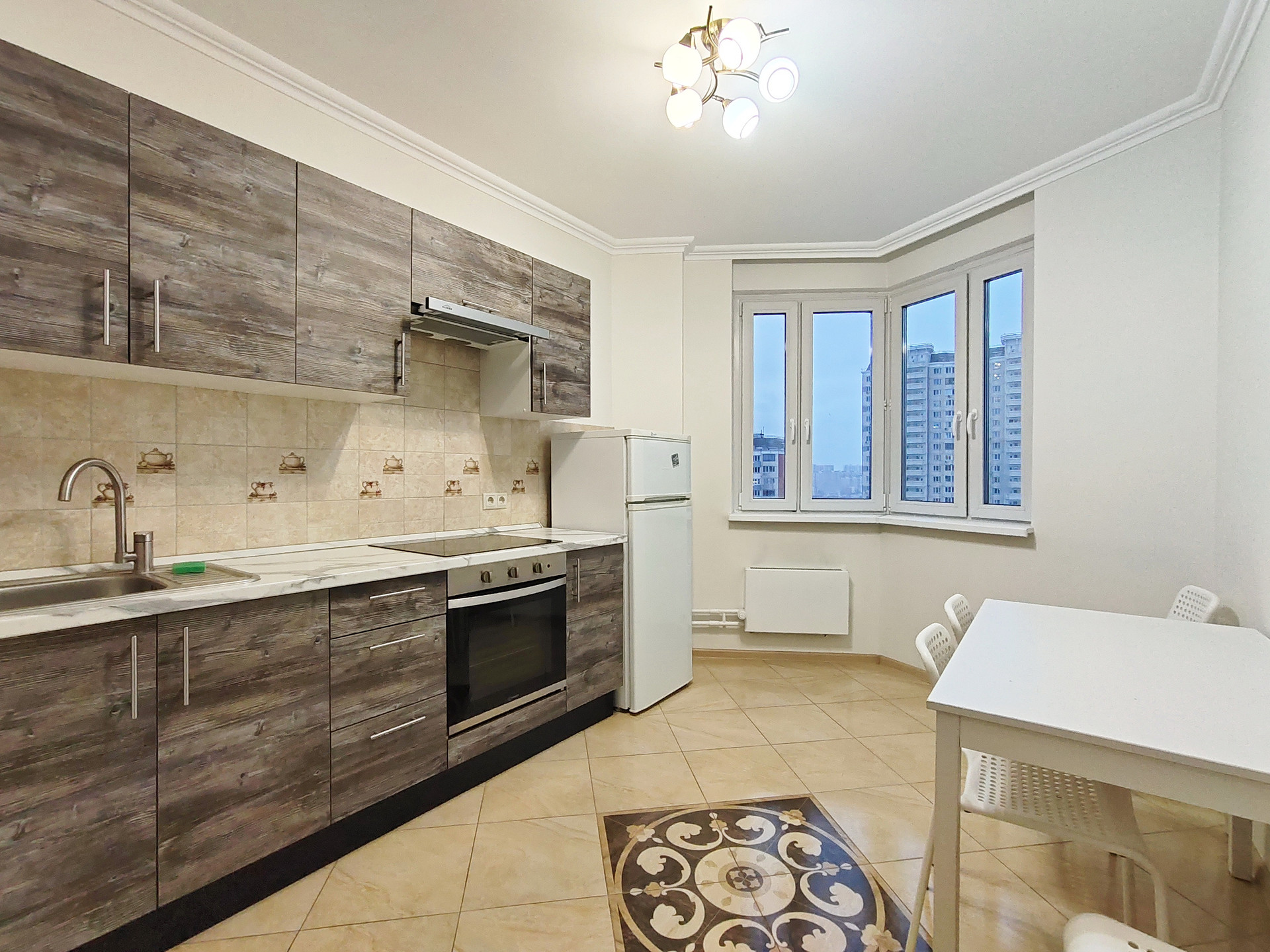 Большая светлая квартира, большие окна дают много естественного света. Дополнительное пространство и необычный вид квартиры за счет эркера на кухне. Скрытые гардины на окнах на кухне и во всех комнатах. Нет окон на против! Окна выходят во двор, а не к метро.