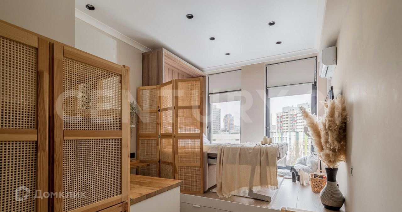 Студия, общей площадью 18 кв.м.. Дизайн продумывался очень тщательно, в подиуме огромная система хранения для вещей, все ящики выдвигаются на всю длину подиума. Максимально удобная кровать трансформер и легкая, опускается одной рукой. Благодаря этой конструкции Вы имеете полноценное спальное место с удобной кроватью и матрасом, а также гостиную зону с диваном.