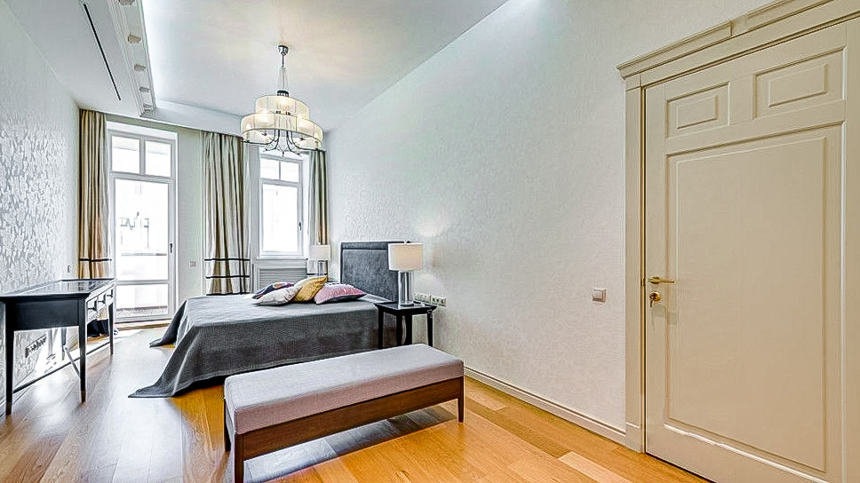 Великолепная 4-комнатная квартира, гордо расположенная на третьем этаже пяти  этажного здания. Внутри вас ожидают три превосходно изолированные комнаты, просторная кухня-гостиная, а также три удобных санузла. Великолепное дополнение - лоджия с потрясающим видом. Уникальность этого места подчеркивается потолками высотой 3,4 метра. В подъезде всего лишь четыре квартиры, что обеспечивает вам максимум приватности. На первом этаже имеется удобное помещение для хранения велосипедов, колясок и других вещей. Дополнительным преимуществом является подземный паркинг, а также охраняемая территория с системой видеонаблюдения. Кроме того, вы сможете пользоваться прямым выходом на Тверской бульвар. Это прекрасное предложение для истинных ценителей недвижимости.