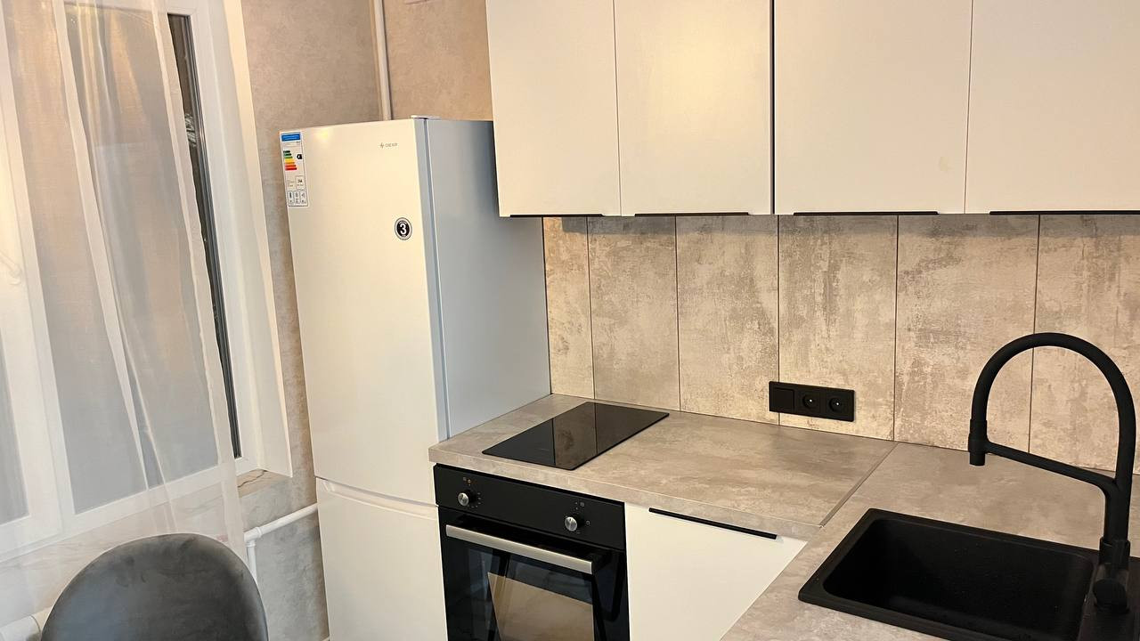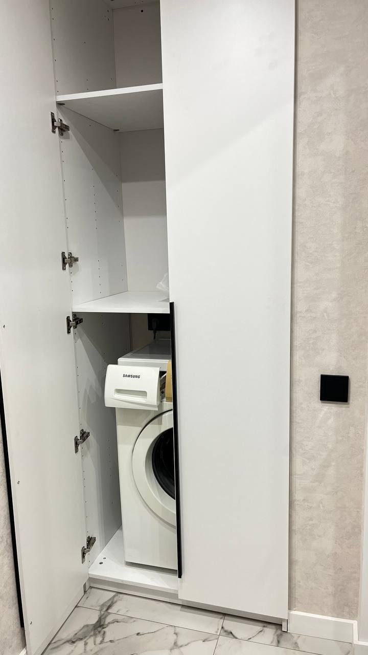 На кухне остается встроенная ПММ, духовой шкаф, индукционная варочная панель, холодильник.