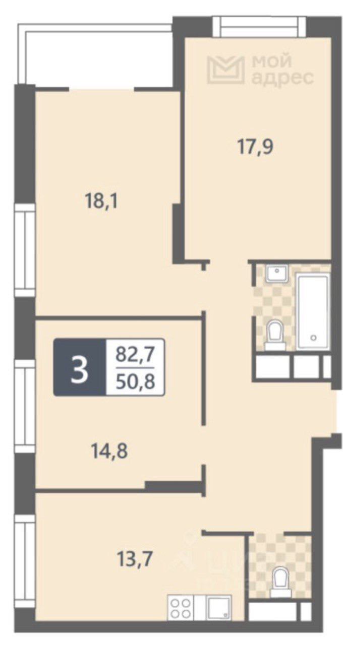 3-комнатная квартира, 82.2 м2, этаж 26 / 27, на продажу в Москве, жилой комплекс Мой Адрес на Клинской, к1