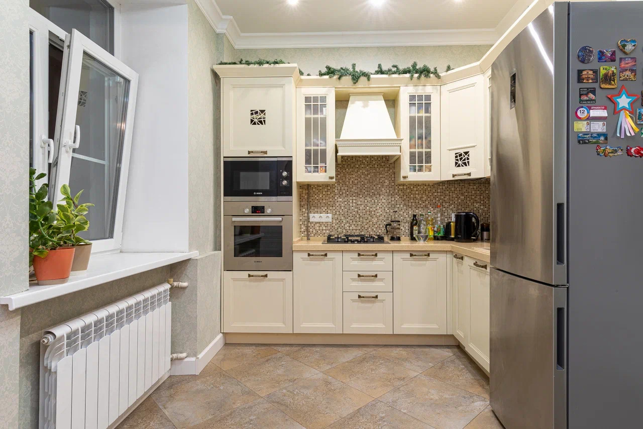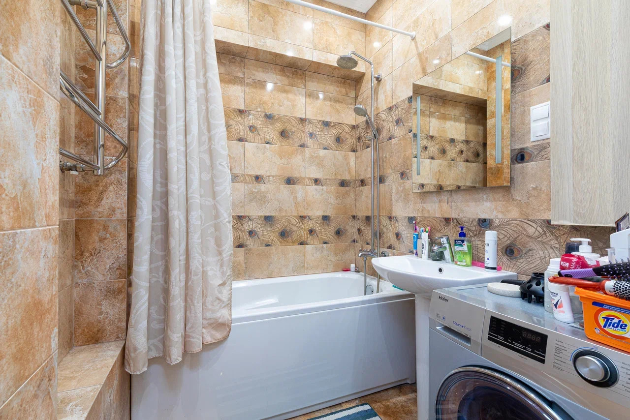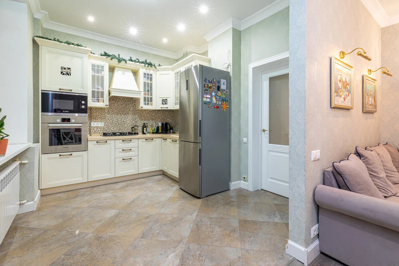 Новым владельцам остаются полностью укомплектованная кухня с холодильником и духовым шкафом, стиральная машина, вся встроенная мебель.