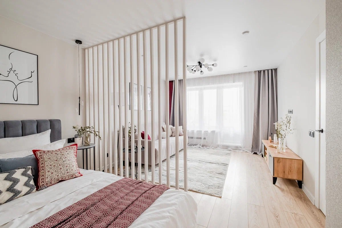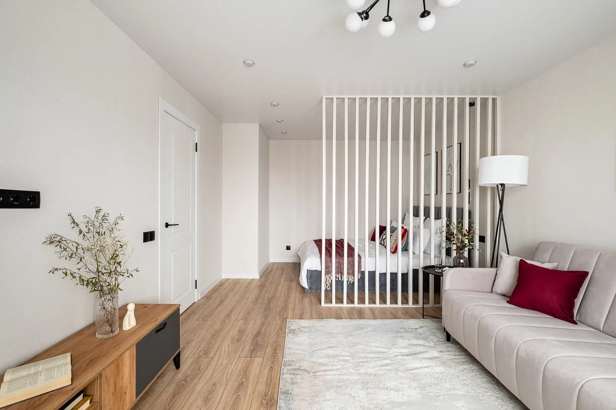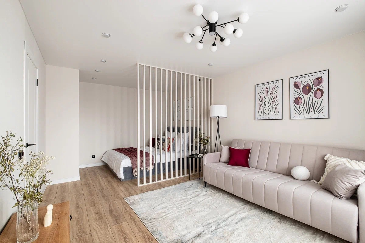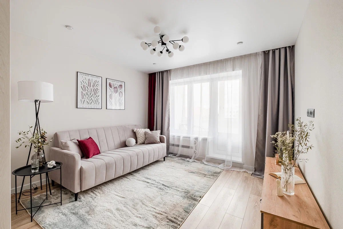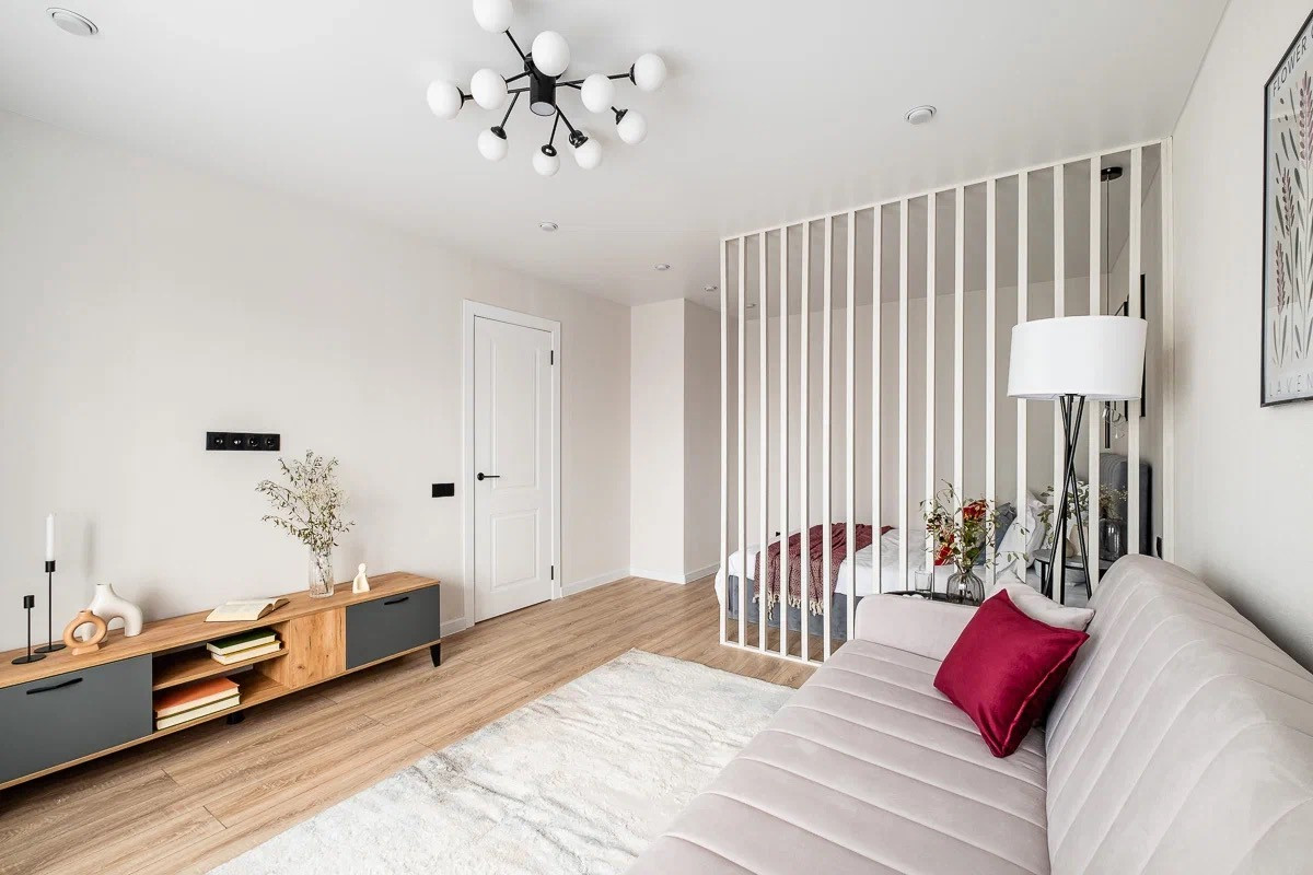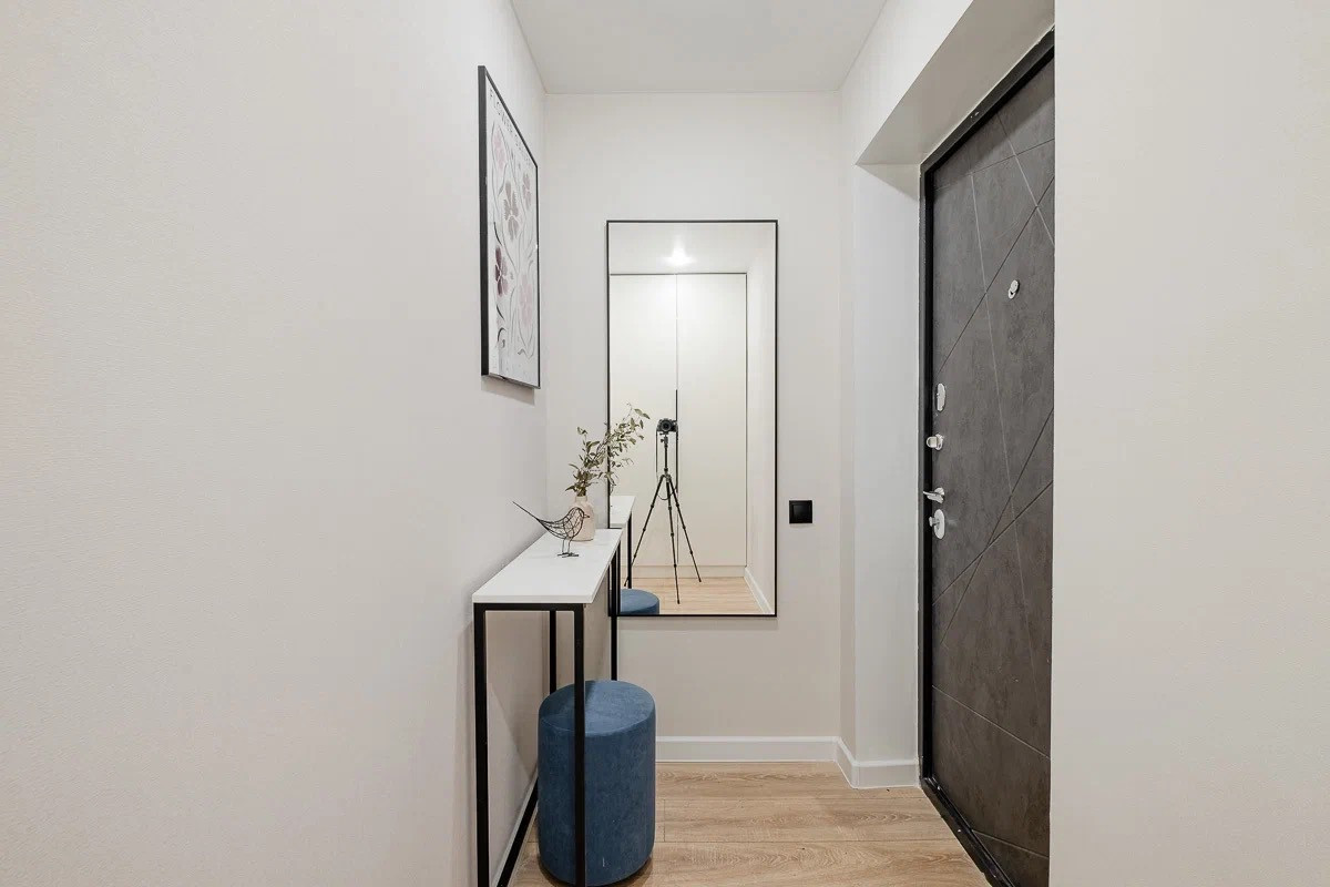 Грамотная планировка: есть зоны хранения, уединенная спальня, гостиная с раскладывающимся диваном, полноценная кухня со всей техникой.