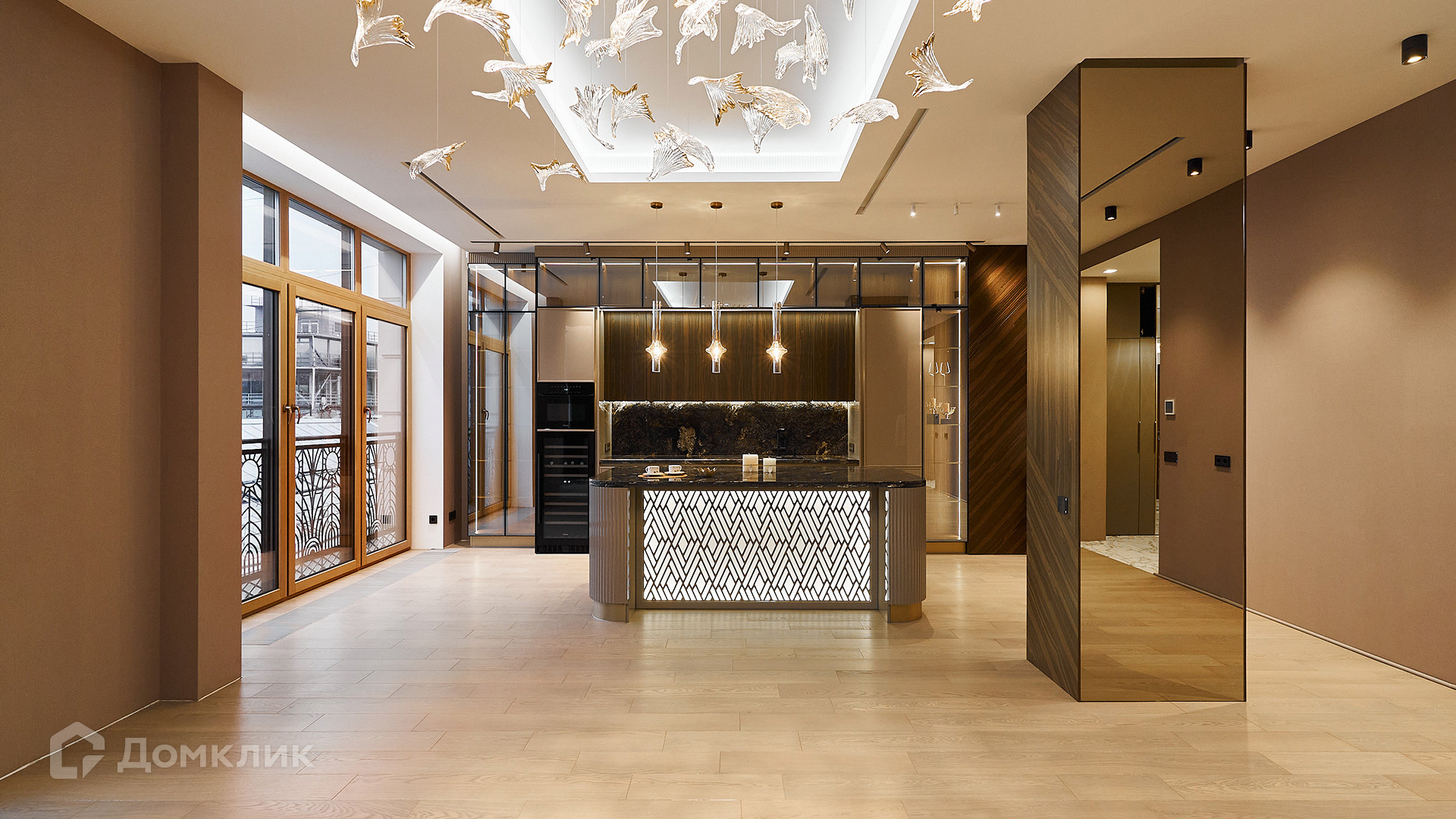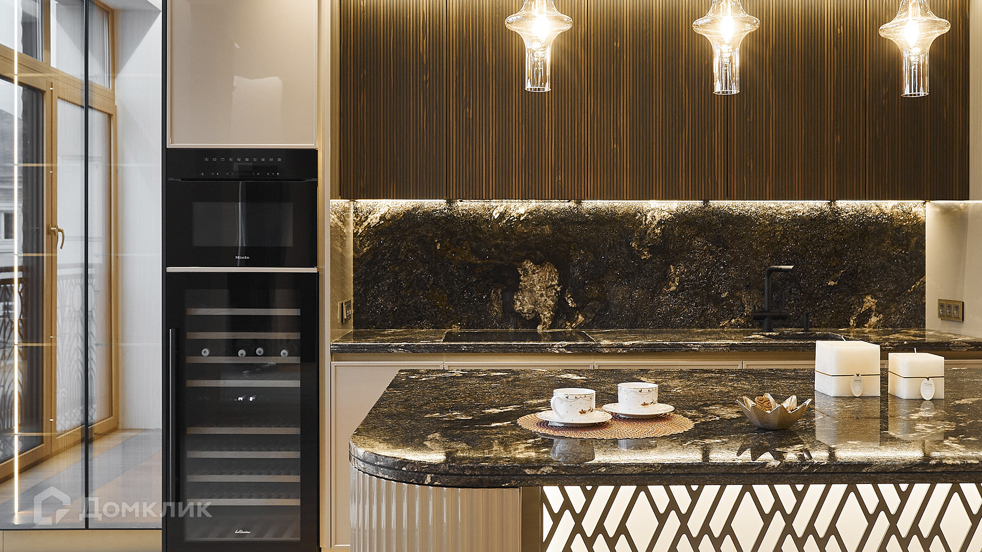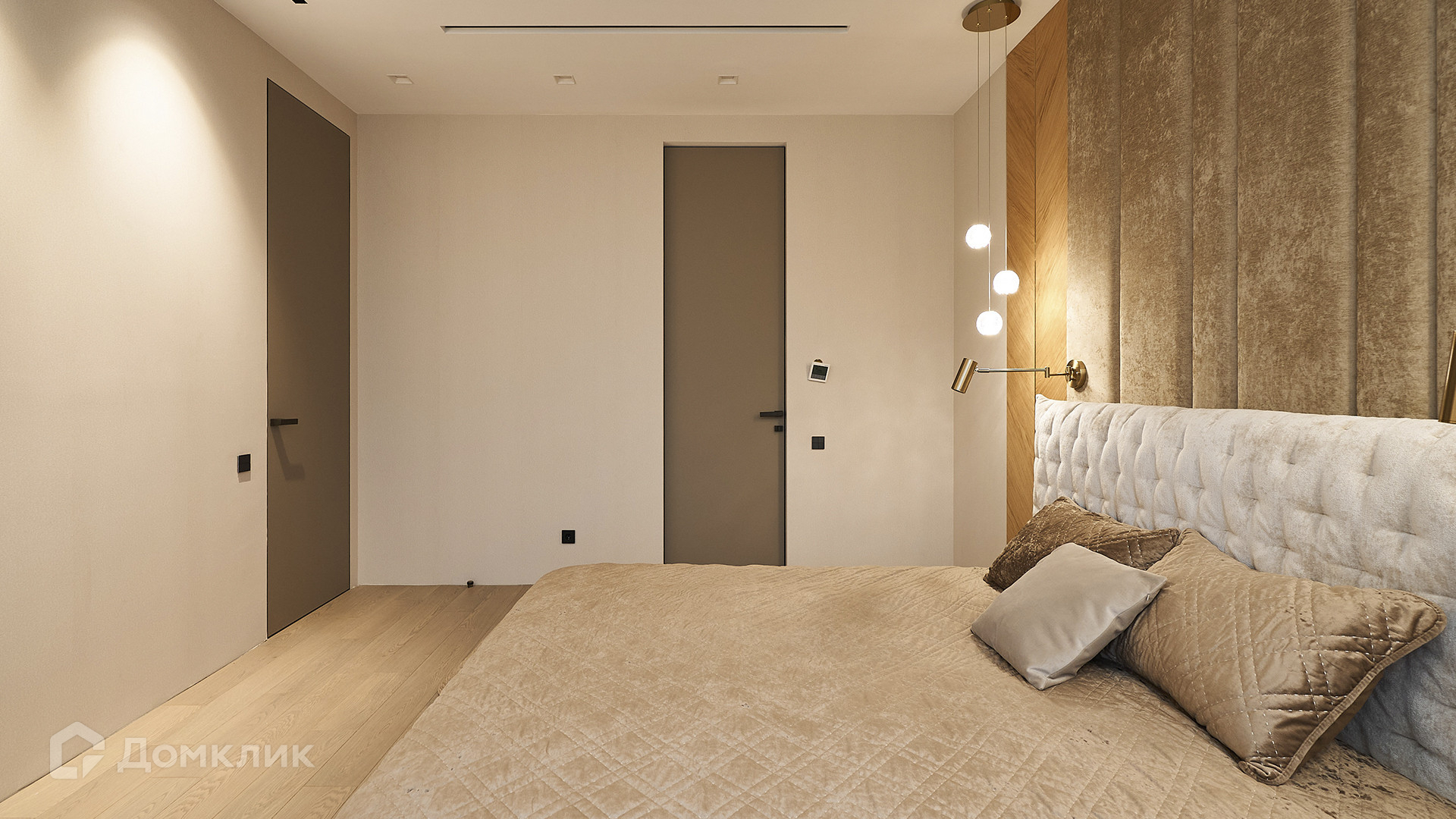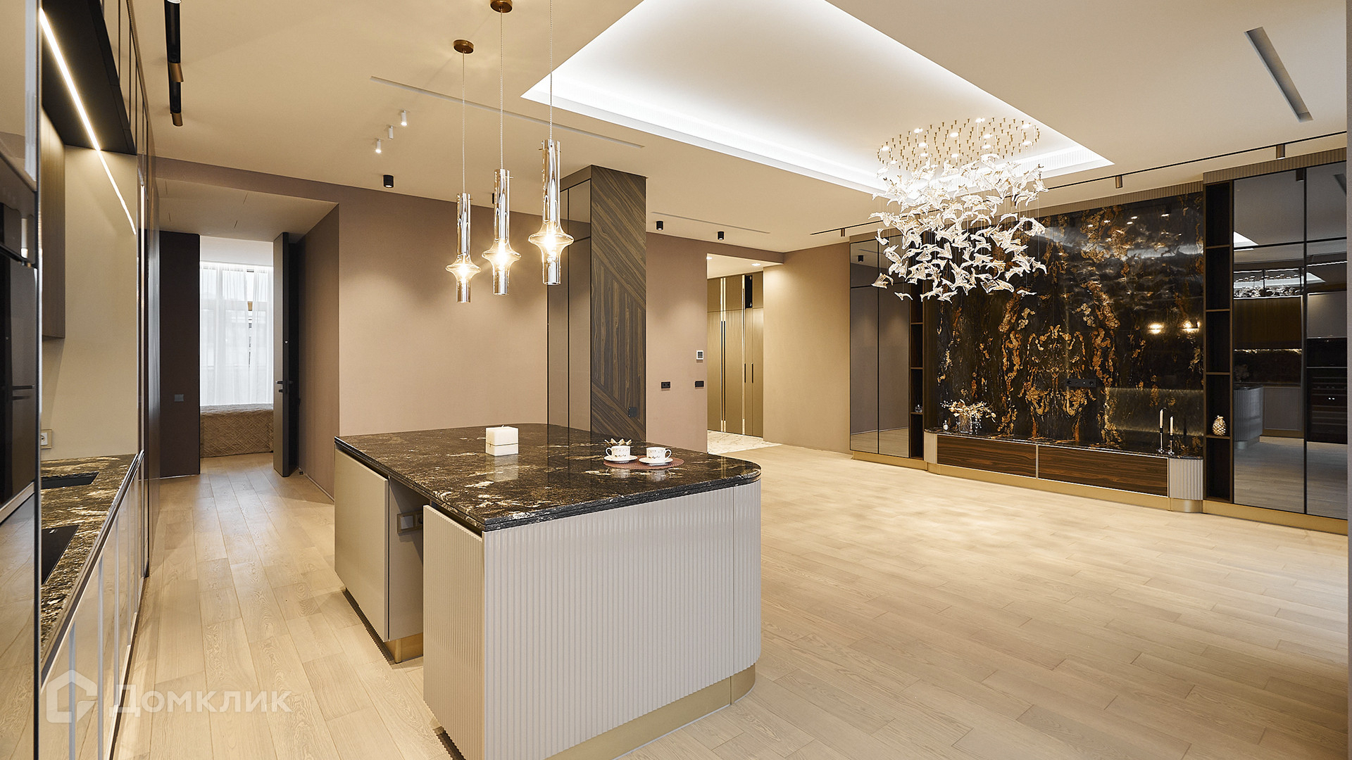 ID 169 569. Квартира с 2-мя спальнями общей площадью 144 м² расположена на 4-м этаже в комплексе делюкс-класса «Резиденция на Всеволожском». В квартире выполнена чистовая премиальная отделка в бежевых и кофейных тонах с акцентами черного и золотого. В интерьере натуральные материалы: камень, дерево, шпон американского ореха, бразильский и индийский гранит. Бытовая техника премиальных брендов Miele и Smeg, сантехника Villeroy&Boch, частичная меблировка.
